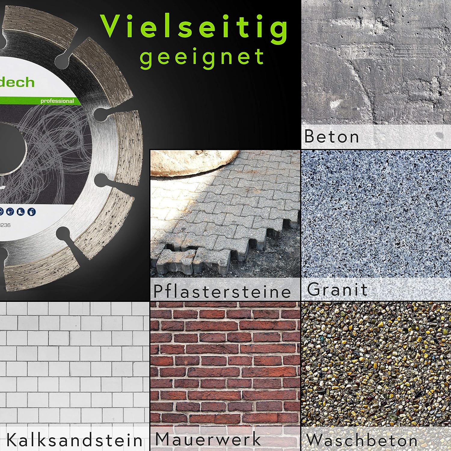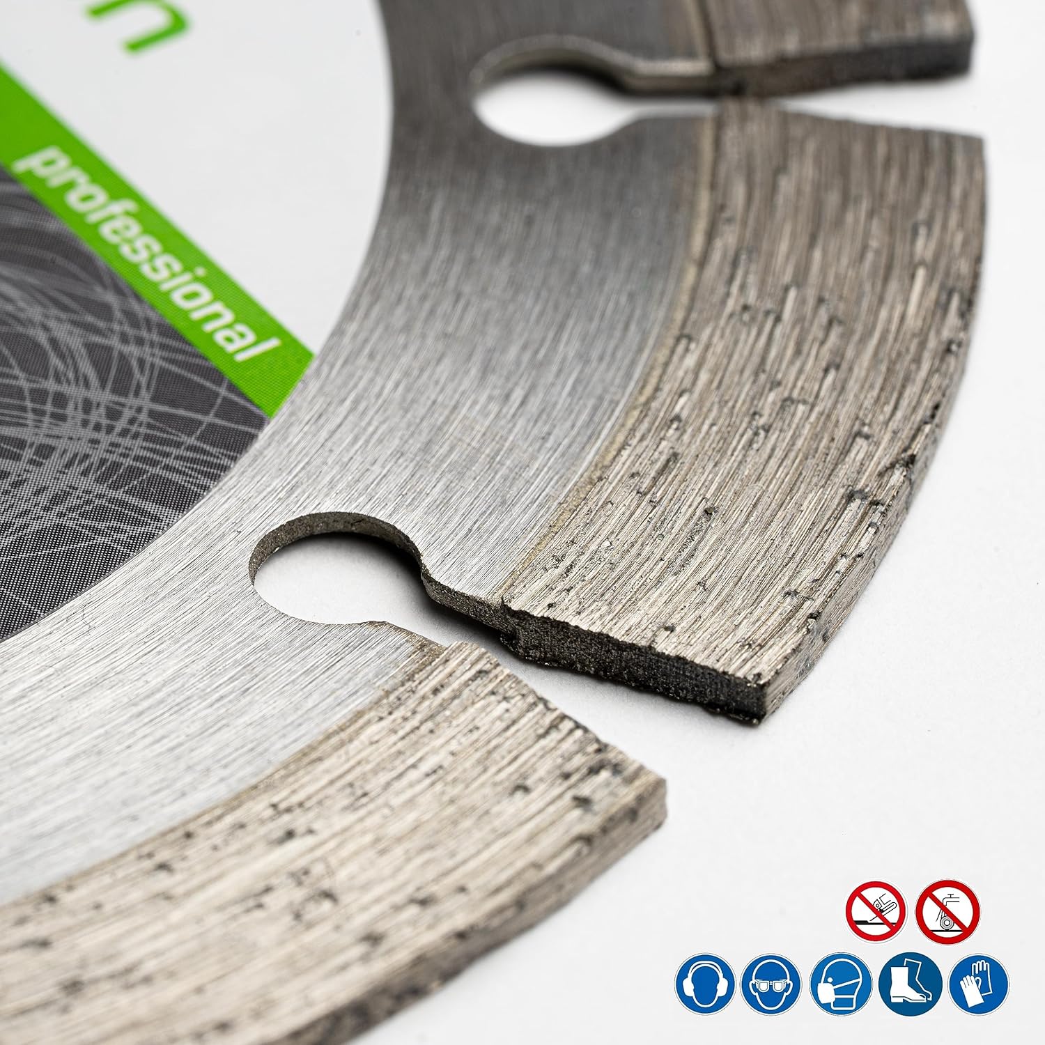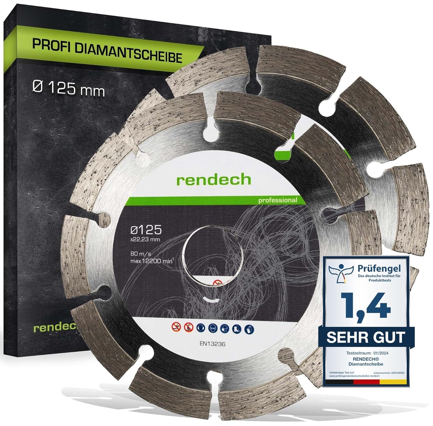 Dieses Set enthält zwei Diamanttrennscheiben von rendech mit 125 mm Durchmesser für anspruchsvolle Trennarbeiten im Bau und Handwerk. Die Scheiben sind für einen ruhigen Lauf ausgelegt und unterstützen saubere Schnittkanten bei harten mineralischen Werkstoffen. Die 10 mm hohen Segmente sind auf eine lange Standzeit und konstante Leistung ausgelegt. Geeignet zum Trennen von Beton, Granit, Ziegel, Stein, Mauerwerk, Klinker und Waschbeton. Die Aufnahmebohrung beträgt 22,23 mm und passt damit auf gängige Winkelschleifer und Mauernutfräsen. Ausgelegt für Trockenschnitt und für den beruflichen Dauereinsatz geeignet. Gefertigt nach EN 13236. Bitte die angegebene Laufrichtung auf der Scheibe beachten und nur mit passenden Schutzvorrichtungen verwenden.