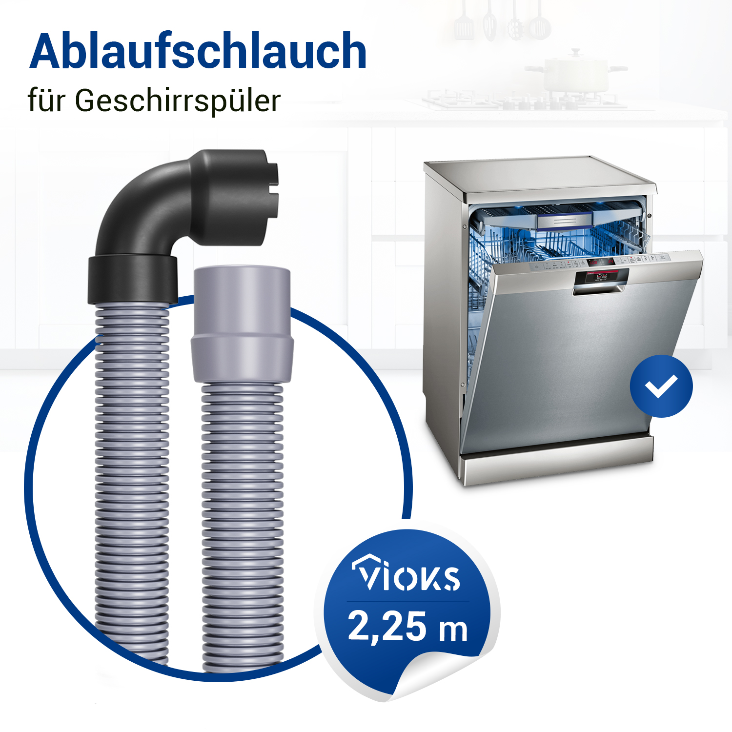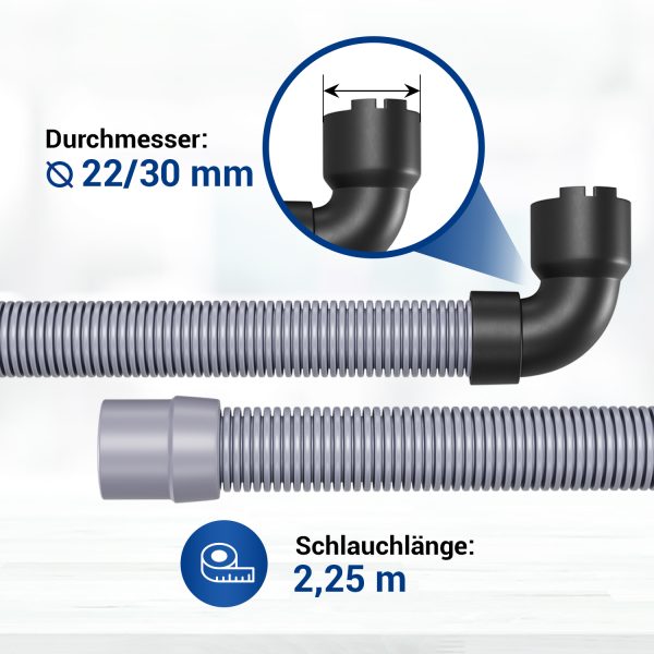 Wir bieten Ihnen einen Abwasserschlauch für den Geschirrspüler an. Der Ablaufschlauch-Anschluss hat eine gerade Seite mit dem Innendurchmesser von 22 mm und eine gewinkelte Seite mit dem Innendurchmesser von 30 mm. Die Länge des Geschirrspüler-Schlauches ist 2,25 m.