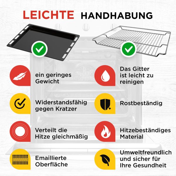 Dank des hochwertigen Edelstahls und der Emaillierung sind unsere Gitterroste und Backbleche sehr langlebig. Die Löcher am Rand des Backblechs sorgen für eine optimale Wärmeverteilung beim Backen. Backblech passt dadurch auch zum Einhängen. Sie können Ofenblech als Fettpfanne, Bratenblech verwenden.