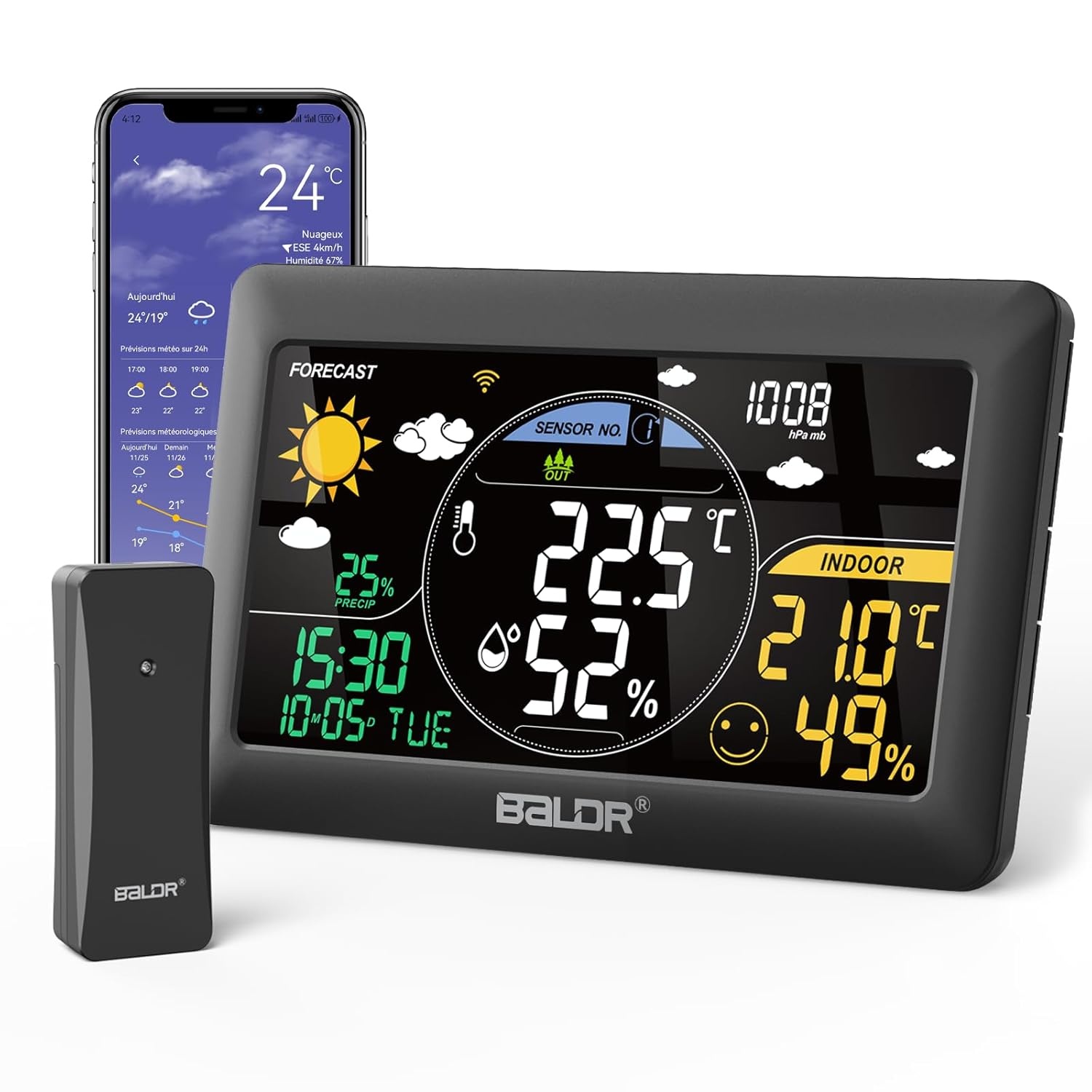 Die BALDR WLAN-Wetterstation kombiniert Funkmessung und Online-Wetterdaten für eine übersichtliche Kontrolle von Raumklima und Wetterentwicklung. Über 2,4-GHz-WLAN und App können Messwerte bequem am Smartphone abgerufen werden. Das 7,5-Zoll-VA-Farbdisplay bietet eine klare Darstellung mit weitem Blickwinkel und einstellbarer Helligkeit. Erfasst werden Innen- und Außentemperatur sowie Luftfeuchtigkeit, ergänzt um Luftdruckwerte und Verlaufstrends. Die Wettervorhersage wird automatisch aus dem Internet aktualisiert und über Wettersymbole dargestellt, inklusive Hinweis auf mögliche Wetteränderungen. Die Station zeigt Uhrzeit und Kalender an und kann zusätzlich als Wecker mit Schlummerfunktion genutzt werden. Für mehrere Messorte unterstützt das System bis zu drei Außensensoren und eignet sich damit auch für Schlafzimmer, Kinderzimmer, Keller oder Garage. Der Außensensor deckt einen Temperaturbereich von -40 °C bis 60 °C ab. Die Zeit kann nach der WLAN-Verbindung automatisch kalibriert werden. Zudem werden Temperatur-, Luftfeuchtigkeits- und Luftdruckänderungen langfristig aufgezeichnet, um Entwicklungen über längere Zeiträume nachvollziehbar zu machen.