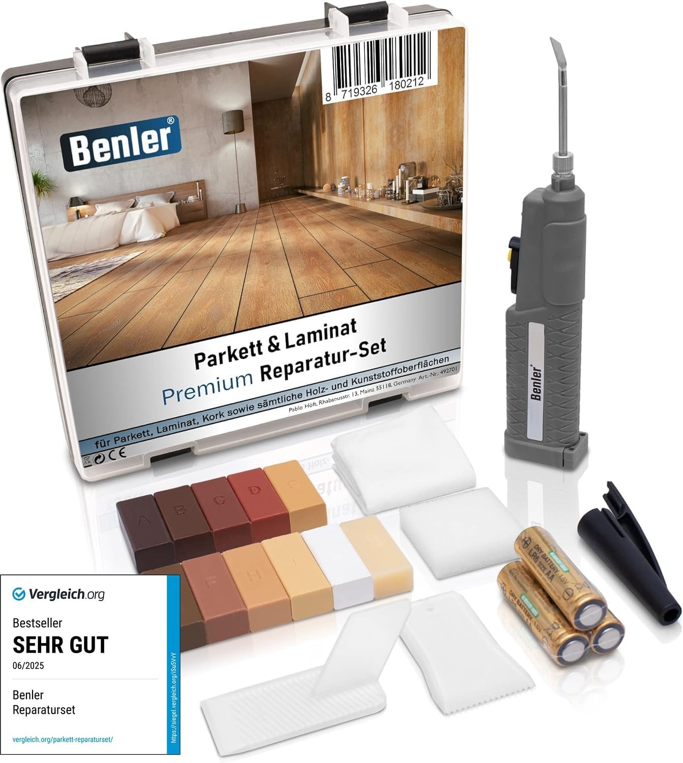 Das BENLER Laminat Reparaturset ist ein vielseitiges Set zur schnellen Ausbesserung typischer Gebrauchsspuren auf verschiedenen Oberflächen. Es eignet sich zum Füllen und Retuschieren von Kratzern, Rissen, Druckstellen und kleinen Löchern. Durch das Arbeiten mit Reparaturwachs lassen sich beschädigte Stellen farblich anpassen und glätten. Das Set ist für Laminat, Parkett und andere Holzoberflächen konzipiert und kann auch auf Vinyl- und Kunststoffoberflächen eingesetzt werden. Die 2-in-1 Schmelzspitze unterstützt sowohl flächiges Auftragen als auch präzise Detailarbeiten. Enthalten sind 11 Wachsstangen zur Farbanpassung sowie ein Schmelzgerät zum schnellen Erwärmen und Verarbeiten. Ein Spachtel hilft beim sauberen Einbringen und Abziehen des Wachses. Mit dem Schleifhobel können ausgehärtete Stellen plan nachbearbeitet werden. Ein Reinigungstuch und ein Schwamm unterstützen die Vorbereitung und Nachreinigung der Reparaturstelle. Das Set wird mit Batterien betrieben und ist für den mobilen Einsatz im Haushalt geeignet.