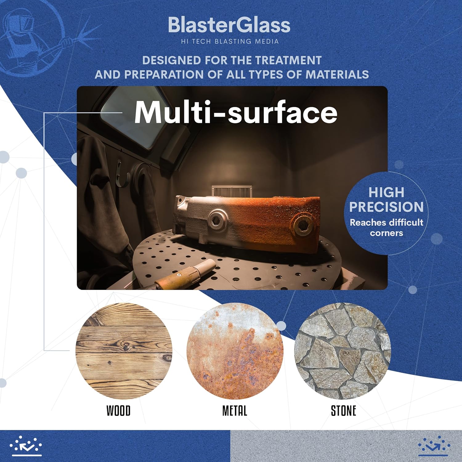 Das BlasterGlass Hi Tech Strahlmittel in der Körnung 40 bis 60 eignet sich für Strahlkabinen sowie für den Einsatz mit Sandstrahlpistolen. Die Partikelgröße von 0,3 bis 0,6 mm unterstützt eine kontrollierte Oberflächenbearbeitung und ist für viele typische Strahlarbeiten ausgelegt. Es ist für die Vorbereitung und Reinigung von eisenhaltigen und nichteisenhaltigen Oberflächen konzipiert. Geeignet zum Entlacken, Entrosten, Entschichten und zur allgemeinen Materialreinigung. Einsetzbar auf Materialien wie Metall, Holz, Stein, Beton und Marmor. Das Strahlmittel ist für pneumatische Kompressionsanlagen geeignet und kann sowohl trocken als auch nass verarbeitet werden. Der erforderliche Arbeitsdruck und die Strahlzeit lassen sich je nach Oberfläche und gewünschtem Ergebnis anpassen. Es enthält keine freie Kieselsäure und ist damit eine sichere Alternative zu klassischem Strahlsand. Hergestellt in der Europäischen Union.