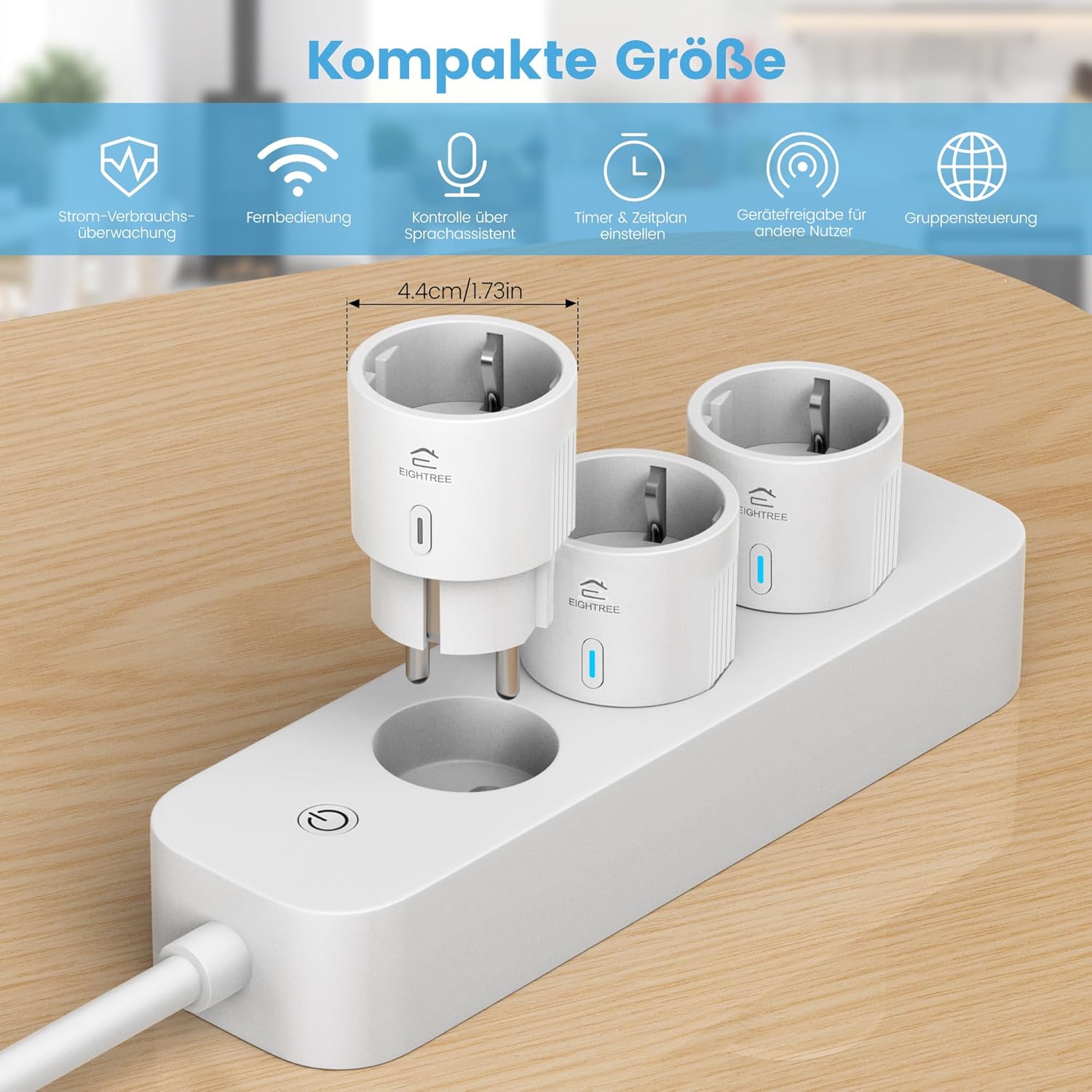 Die EIGHTREE Smart WLAN Steckdose im 4er Pack ermöglicht das komfortable Schalten von Elektrogeräten per App und Sprachsteuerung. Dank Ultra Mini Bauform passen die Steckdosen auch nebeneinander in Steckdosenleisten. Die integrierte Strommessung zeichnet den Energieverbrauch je Gerät auf und stellt Auswertungen über verschiedene Zeiträume bereit. Über die Smart Life App lassen sich Geräte aus der Ferne ein und ausschalten sowie Zeitpläne und Timer einrichten. Die Steckdosen sind kompatibel mit Alexa, Google Home und SmartThings und unterstützen Sprachbefehle für den Alltag. Der verbaute Realtek Chip sorgt für eine stabile WLAN Verbindung und reduziert das Risiko von Verbindungsabbrüchen. Geeignet für Beleuchtung, Kaffeemaschine, Fernseher, Luftbefeuchter und viele weitere Haushaltsgeräte. TÜV Zertifizierung bietet zusätzliche Sicherheit im Betrieb. Die Steckdosen unterstützen kein Tasmota.