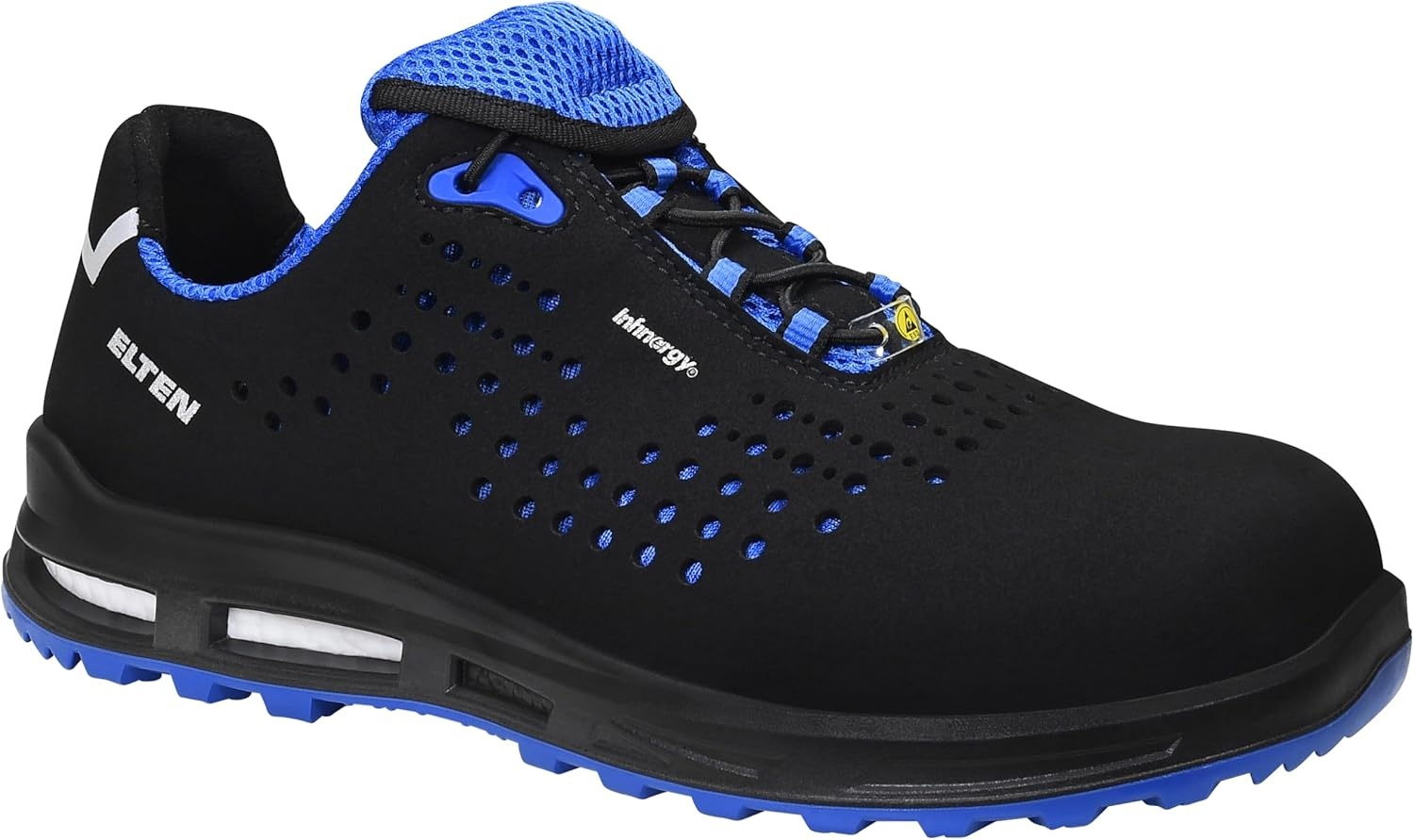 Die Elten Sicherheitshalbschuhe Impulse XXT Blue Low ESD S1 sind für den Arbeitsalltag konzipiert und verbinden sportliches Design mit zuverlässigem Schutz. Die leichte Kunststoffkappe reduziert das Gewicht und unterstützt ermüdungsarmes Tragen. Das Obermaterial aus Mikrofaser und Textil ist pflegeleicht und auf Komfort ausgelegt. Ein atmungsaktives Textilfutter fördert ein angenehmes Fußklima. Die gepolsterte Lasche hilft, Druckstellen zu vermeiden. Die ESD-Ausstattung unterstützt den Einsatz in ESD-sensiblen Bereichen. Eine ganzflächige Einlegesohle sorgt für zusätzliche Dämpfung und Komfort. Die Softvlies-Brandsohle ist ESD-fähig und unterstützt den Tragekomfort. Die PU PU Laufsohle bietet gute Dämpfung und ist auf sicheren Tritt ausgelegt. Zertifizierung nach EN ISO 20345 S1 SRC, Form A.