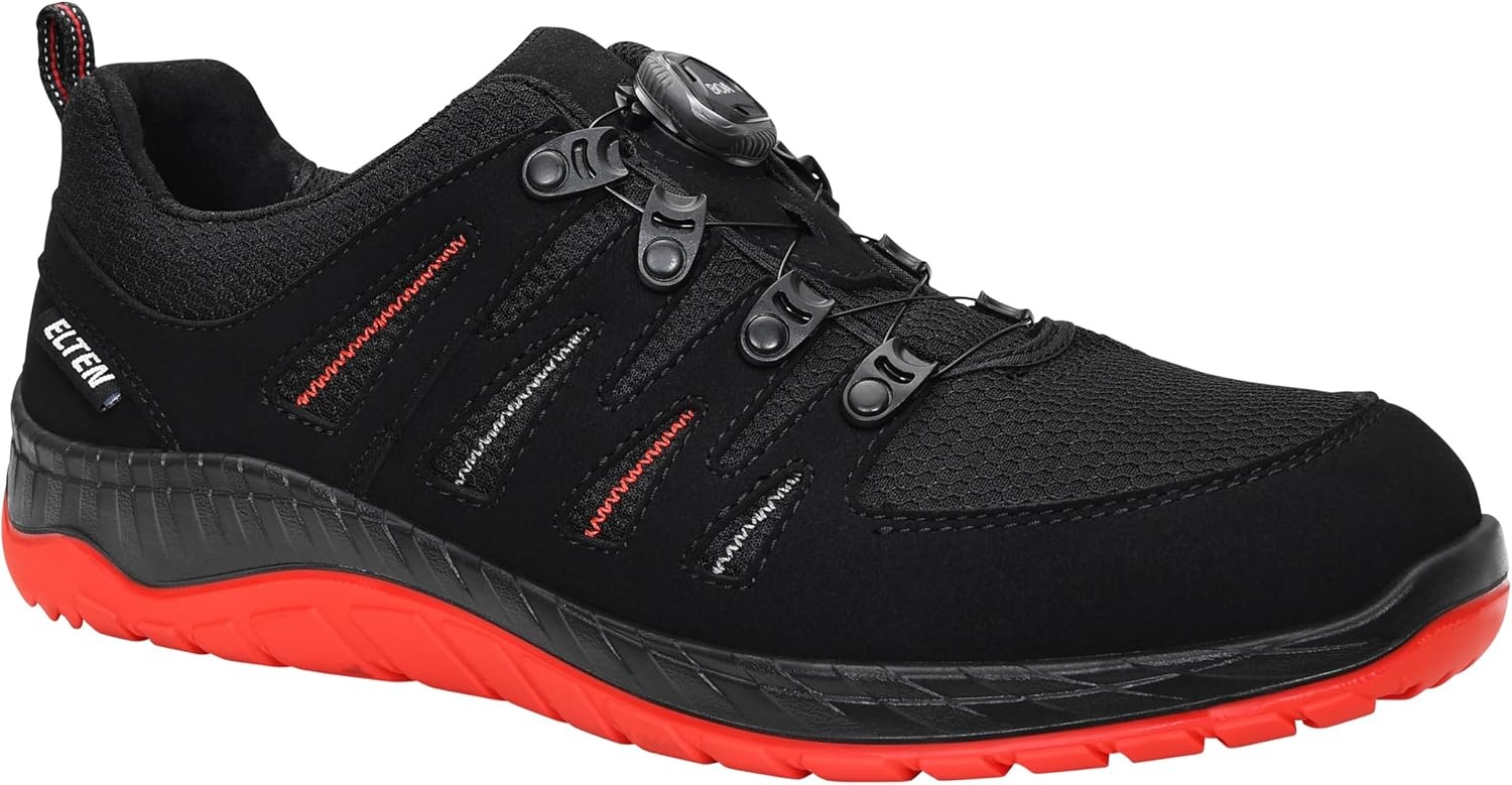 Die ELTEN Sicherheitsschuhe Maddox BOA in schwarz rot sind sportlich geschnittene Low Sicherheitsschuhe für Damen und Herren. Der praktische BOA Drehverschluss ermöglicht schnelles An und Ausziehen sowie eine gleichmäßige Anpassung. Das Textil Obermaterial sorgt für ein geringes Gewicht und angenehmen Tragekomfort im Arbeitsalltag. Die Stahlkappe schützt die Zehen zuverlässig vor Stößen und Druck. Die S3S Schutzklasse bietet hohen Schutz für anspruchsvolle Einsatzbereiche. Der ESD Schutz unterstützt den Einsatz in ESD sensiblen Arbeitsumgebungen. Die flache Low Bauform bietet gute Beweglichkeit und eignet sich für viele Tätigkeiten in Industrie, Handwerk und Lager. Die rutschhemmende Laufsohle unterstützt sicheren Stand auf unterschiedlichen Untergründen. Die dämpfende Konstruktion hilft, die Belastung bei langem Stehen und Gehen zu reduzieren. Das moderne Design verbindet Sicherheit und sportliche Optik.