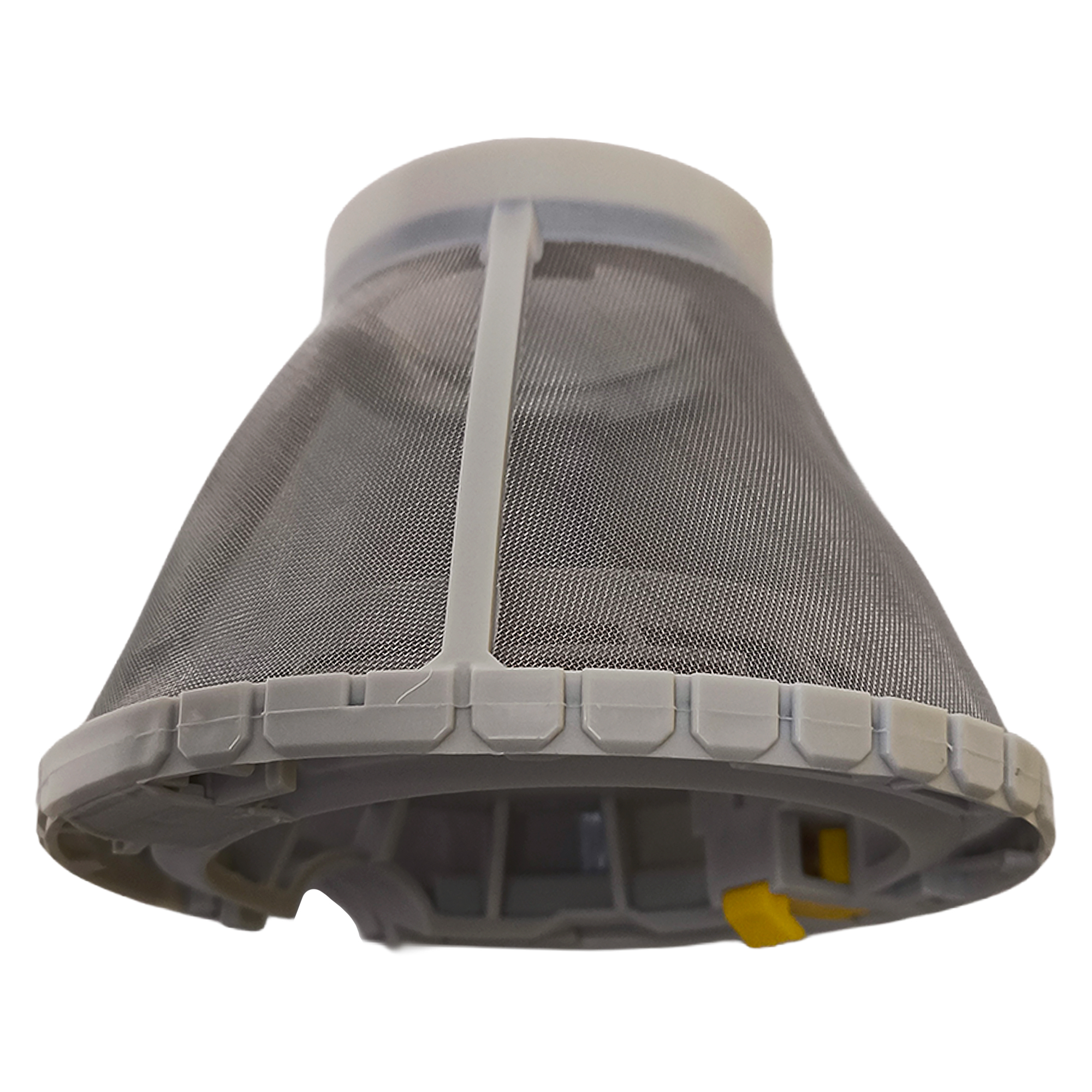 Dieser aufklappbare Mikrofeinfilter ist unter dem großen eckigen Grobsieb aus Metall eingesetz