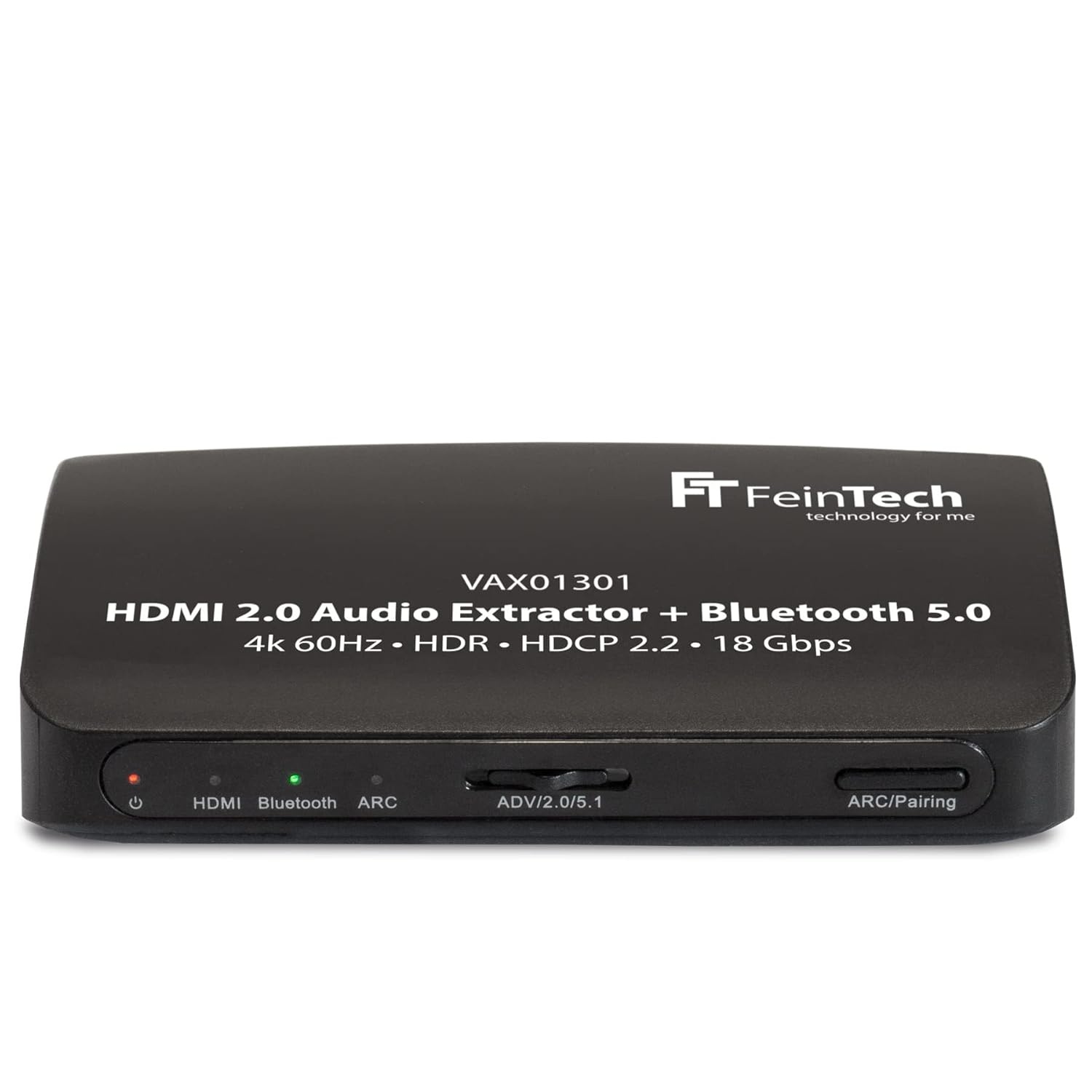 Der FeinTech VAX01301 ist ein HDMI Audio Extractor, der Audiosignale flexibel aus einem HDMI-Signal auskoppelt und für verschiedene Ausgabegeräte bereitstellt. Er kann wahlweise an einem Fernseher mit HDMI-ARC oder an einem Zuspieler mit HDMI-Ausgang betrieben werden. Für die kabellose Tonübertragung steht ein Bluetooth-5.0-Transmitter zur Verfügung, sodass sich gängige Bluetooth-Kopfhörer oder -Lautsprecher koppeln lassen. Zusätzlich bietet das Gerät einen optischen Digitalausgang sowie einen analogen Cinch-Ausgang für den Anschluss an Soundanlagen, Aktivlautsprecher oder Verstärker. Über den HDMI-Eingang werden Videoformate bis 4K bei 60 Hz unterstützt, einschließlich HDR und Dolby Vision, wodurch die Bildqualität des Zuspielers erhalten bleibt. Die Audio-EDID lässt sich umschalten, um Stereo oder Mehrkanalton zu erzwingen, wobei 5.1-Ausgabe ausschließlich über den optischen Ausgang in Dolby Digital möglich ist. HDCP 2.2 wird unterstützt, was die Nutzung mit vielen geschützten Inhalten erleichtert. HDMI-CEC kann durchgeschleift werden, damit kompatible Steuerfunktionen erhalten bleiben. Der analoge Audioausgang liefert einen festen Pegel, die Lautstärkeregelung erfolgt daher am angeschlossenen Wiedergabegerät. Die Stromversorgung erfolgt über USB, zum Beispiel über eine USB-Buchse am TV oder über ein separates USB-Netzteil.