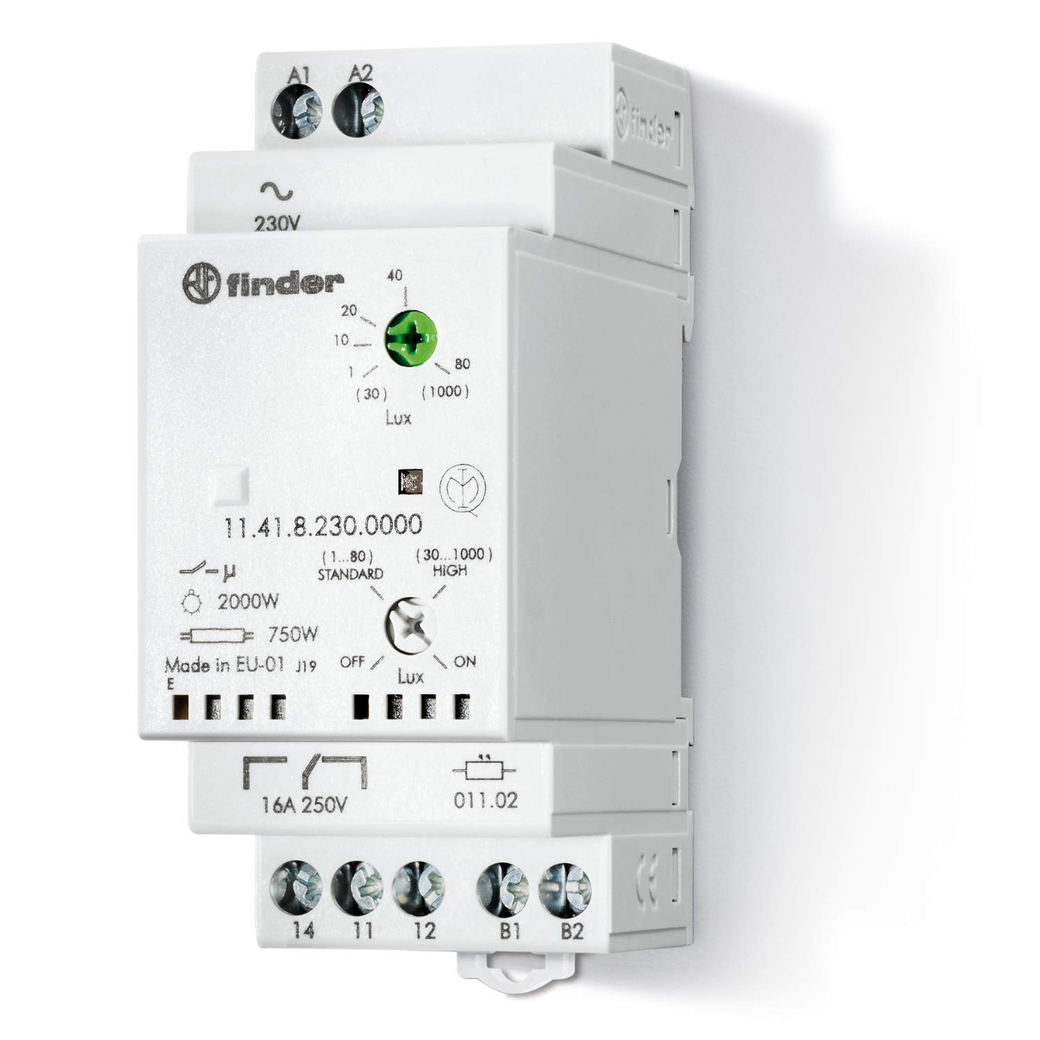 Der Finder Dämmerungsschalter 114182300000PAS ist für den Reiheneinbau vorgesehen und ermöglicht das automatische Schalten von Beleuchtung in Abhängigkeit von der Umgebungshelligkeit. Er arbeitet mit einem Wechslerkontakt und ist für 230 V AC bei 50 bis 60 Hz ausgelegt. Die Einschaltschwelle lässt sich in zwei Bereichen einstellen, wahlweise von 1 bis 80 Lux oder von 30 bis 1000 Lux, um die Schaltung an Standort und gewünschte Lichtverhältnisse anzupassen. Der Schalter unterstützt eine hohe Schaltleistung bis 4000 VA bei 230 V AC1 und ist für einen maximalen Einschaltstrom von 120 A für 5 ms ausgelegt. Für typische Beleuchtungslasten sind unter anderem bis zu 2000 W Glühlampenlast sowie bis zu 1000 VA Leuchtstofflampenlast möglich, auch in Duo-Schaltung. Eine integrierte LED-Anzeige erleichtert die Kontrolle des Schaltzustands. Das Kontaktmaterial besteht aus AgSnO2. Die Einbaubreite beträgt 35 mm. Als Außensensor ist der Typ 011.02 enthalten. EAN 8012823347806.