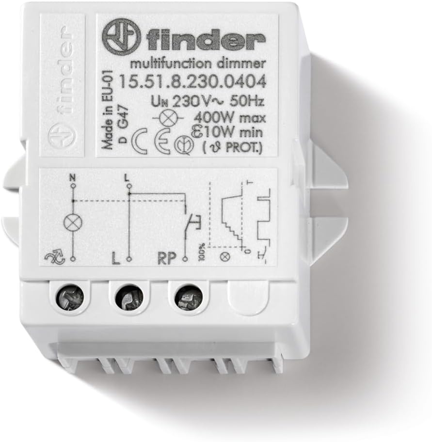 Der Finder elektronische Dimmer 15.51.8.230.0404 ist für die Montage im Chassis oder in Unterputzdosen geeignet. Er dimmt linear und unterstützt zwei über einen Taster wählbare Funktionsweisen. Wahlweise ist der Betrieb mit oder ohne Memoryfunktion möglich. Der Dimmer ist für Glühlampen und Halogenlampen einsetzbar. Die maximale Ausgangsleistung beträgt 400 W. Ein thermischer Überlastschutz ist integriert. Die Einschaltdauer ist für den Dauerbetrieb ausgelegt. Die minimale Ausgangsleistung beträgt 10 W. Die Bedienung erfolgt über einen Drucktaster.