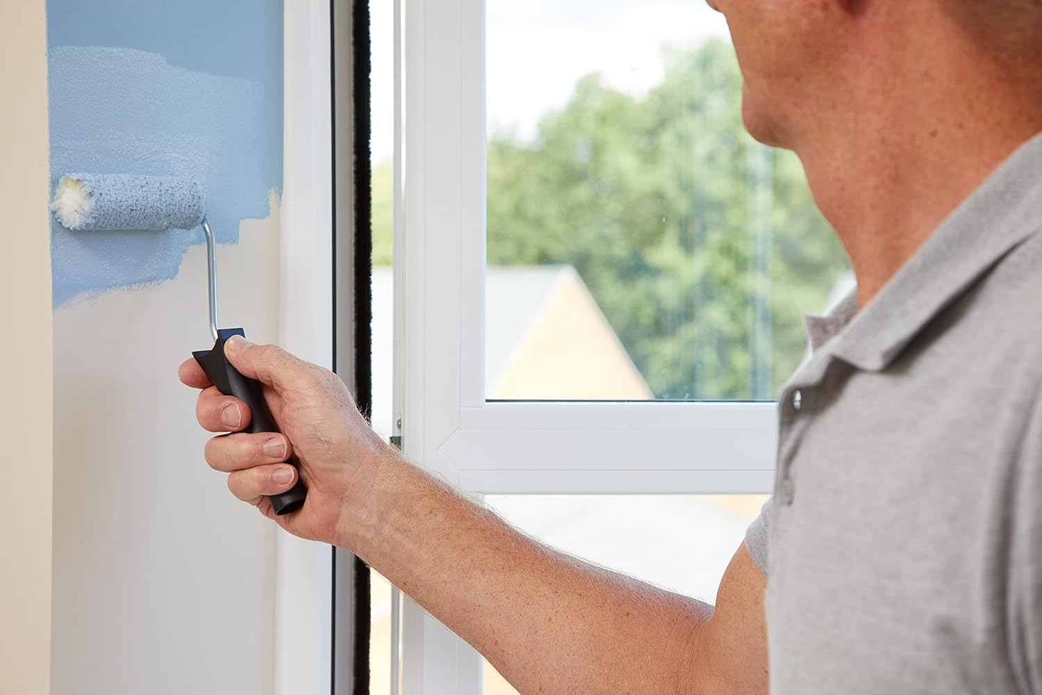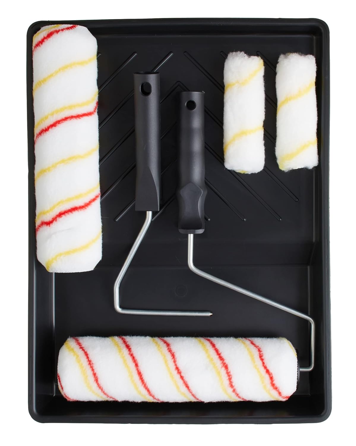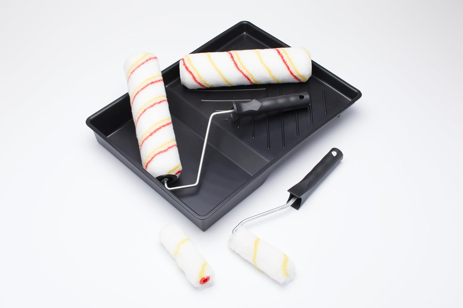 Dieses Fit For The Job Dispersionsfarbroller Set ist für Streicharbeiten mit Dispersionsfarben im Innenbereich ausgelegt und eignet sich besonders für Wände und Decken. Enthalten sind zwei große Farbwalzen mit 225 mm Breite für zügiges Arbeiten auf größeren Flächen sowie zwei Mini Farbwalzen mit 100 mm Breite für kleinere Bereiche und schwer zugängliche Stellen. Die gewebten Walzenhülsen sind auf gleichmäßige Farbaufnahme und saubere Abgabe ausgelegt, um ein glattes, gleichmäßiges Ergebnis zu unterstützen. Die großen Rollen sind für glatte bis halbglatte Untergründe geeignet, zum Beispiel Putz und Trockenbau, sowie für leicht bis mittel strukturierte Decken. Die Minirollen erleichtern das Streichen an Kanten, um Fenster, über Türen sowie hinter Heizkörpern und entlang von Rohren. Die mitgelieferte Farbwanne besitzt einen tiefen Abrollbereich mit strukturierter Fläche, damit die Walze gleichmäßig geladen werden kann. Die Wanne besteht aus recyceltem Kunststoff und ist für die Reinigung in warmem Wasser und wiederholte Nutzung geeignet. Das Set ist praktisch, wenn mit mehreren Farbtönen gearbeitet wird, da mehrere Rollen bereitliegen. Ideal für Heimwerker, Renovierungen und Ausbesserungen im Wohnbereich.
