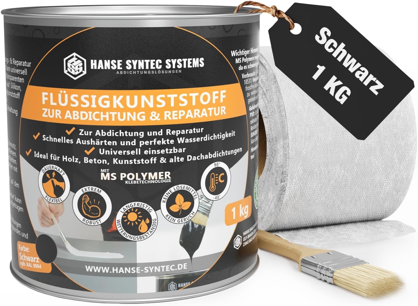 Dieses HSS Flüssigkunststoff Abdichtungsset auf MS Polymer Basis eignet sich zur zuverlässigen Abdichtung und Versiegelung verschiedenster Flächen. Die Beschichtung ist UV und witterungsbeständig und damit ideal für dauerhafte Anwendungen im Außenbereich. Das Material bleibt hoch elastisch, ist alterungsbeständig und hilft, Rissbildung durch Bewegung des Untergrunds zu reduzieren. Geeignet für Holz, Glas, Metall, Zink, Blech, Dachbahnen sowie viele weitere Untergründe. Auch für die Sanierung bestehender Abdichtungen und für schwer erreichbare Stellen nutzbar. Die Verarbeitung ist einfach, da das System einkomponentig und direkt gebrauchsfertig ist. Für die Anwendung werden zwei Schichten aufgetragen, wobei das Vlies zwischen den Schichten eingebettet wird. Das Set ist lösemittelfrei, bitumenfrei und silikonfrei und dadurch materialschonend sowie geruchsarm. Inhalt 1 kg, ausreichend für etwa 1 m² je nach Untergrund und Schichtstärke.