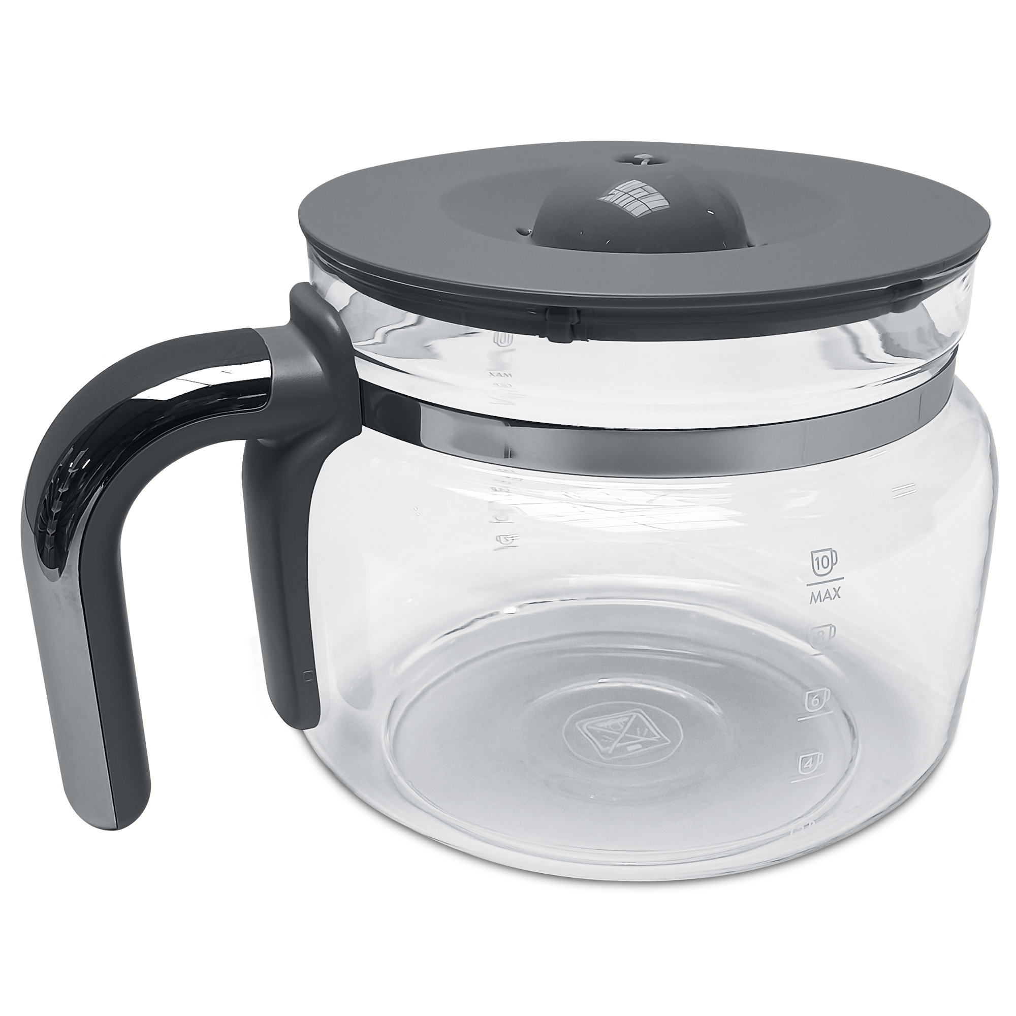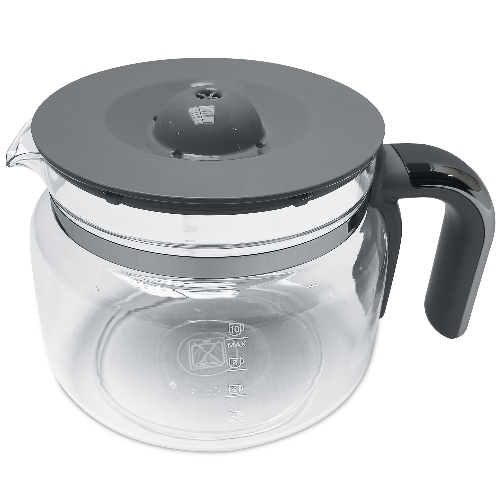 Smeg Kaffeekanne mit silbergrauem Griff und grauem Deckel. Die Glaskanne hat ein Fassungsvermögen von 10 Tassen und ist damit ideal für Familien und Gäste. Markierungen für 2, 4, 6, 8 und 10 Tassen.