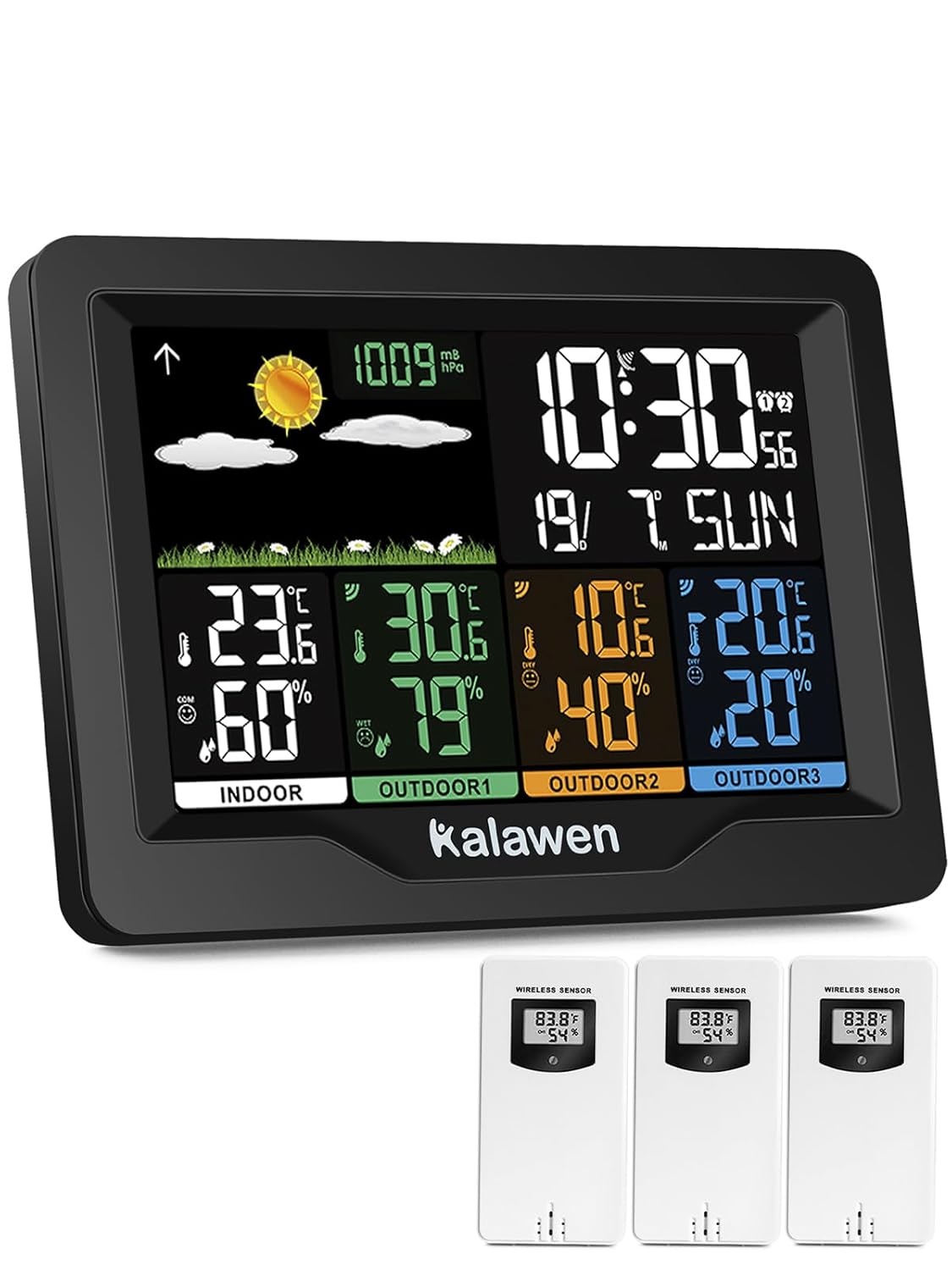 Die Kalawen Funkwetterstation eignet sich zur übersichtlichen Anzeige wichtiger Wetterdaten im Alltag und ist ideal für Zuhause, Büro oder Hausgarten. Sie unterstützt die Messung von Innentemperatur und Innenluftfeuchtigkeit sowie von Außentemperatur und Außenluftfeuchtigkeit über bis zu drei Funksensoren. Die Funkreichweite der Außensensoren beträgt bis zu 60 m bei freier Sicht. Das Farbdisplay stellt Messwerte und Symbole gut lesbar dar. Eine integrierte Wettervorhersage wird aus Temperatur, Luftfeuchtigkeit und Luftdrucktendenzen abgeleitet. Zusätzlich zeigt die Station Datum und Uhrzeit an und verfügt über eine DCF Funkuhr zur automatischen Zeitsynchronisation. Eine Weckfunktion mit Schlummermodus ist vorhanden. Die Außensensoren sind spritzwassergeschützt und sollten für zuverlässigen Betrieb an einem geschützten Ort montiert werden. Die Wetterstation ist für die gleichzeitige Überwachung mehrerer Messpunkte geeignet, zum Beispiel Garten, Terrasse und Keller.