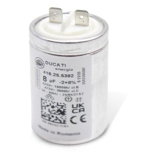 Kondensator mit 6,3 mm AMP-Doppelsteckfahnen & Bodenbefestigungsschraube M8, u.a. für elektrische Hausgeräte.