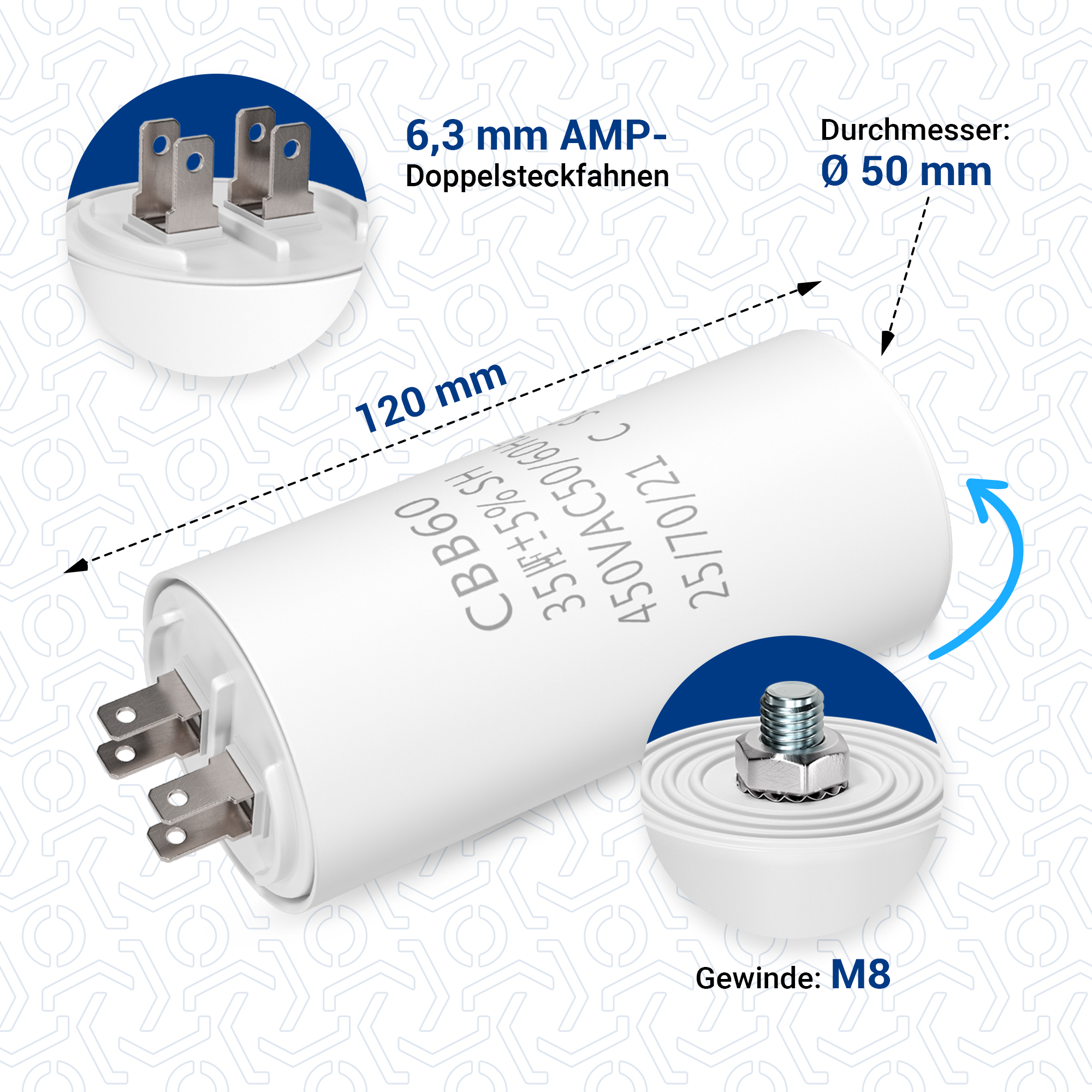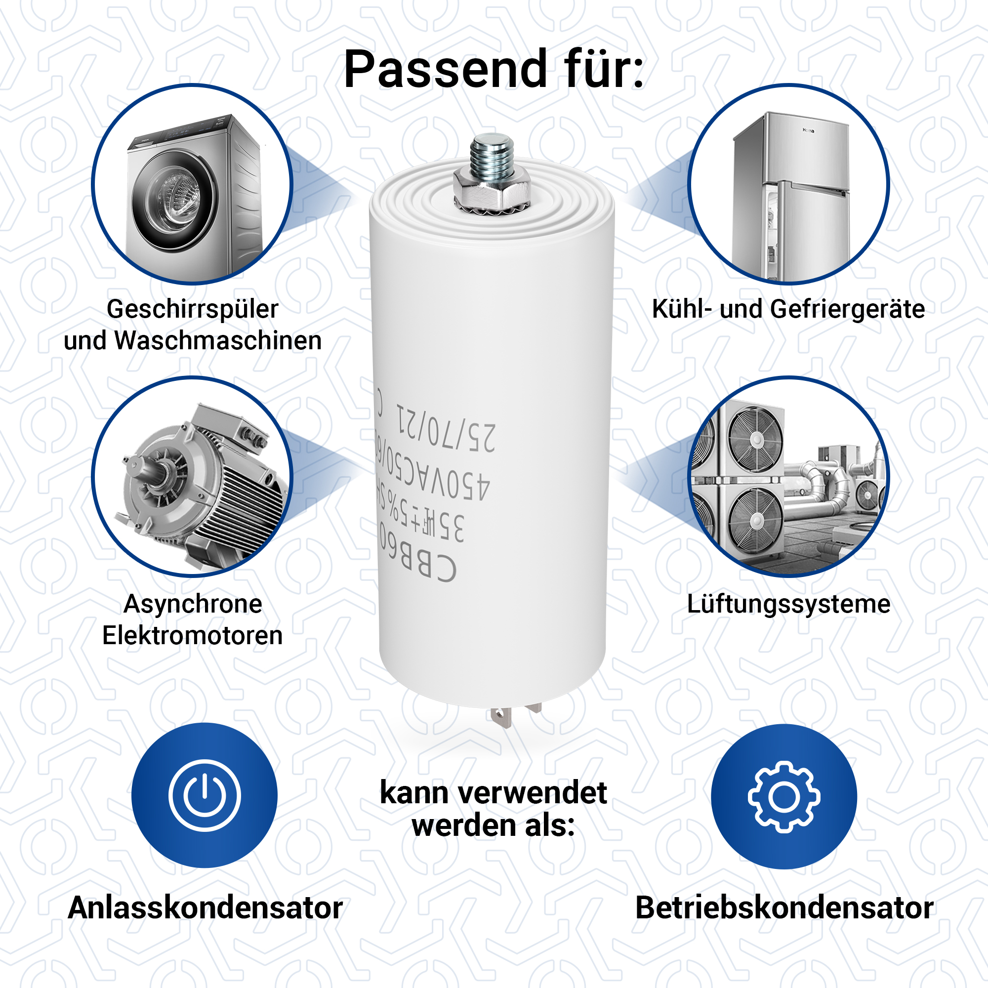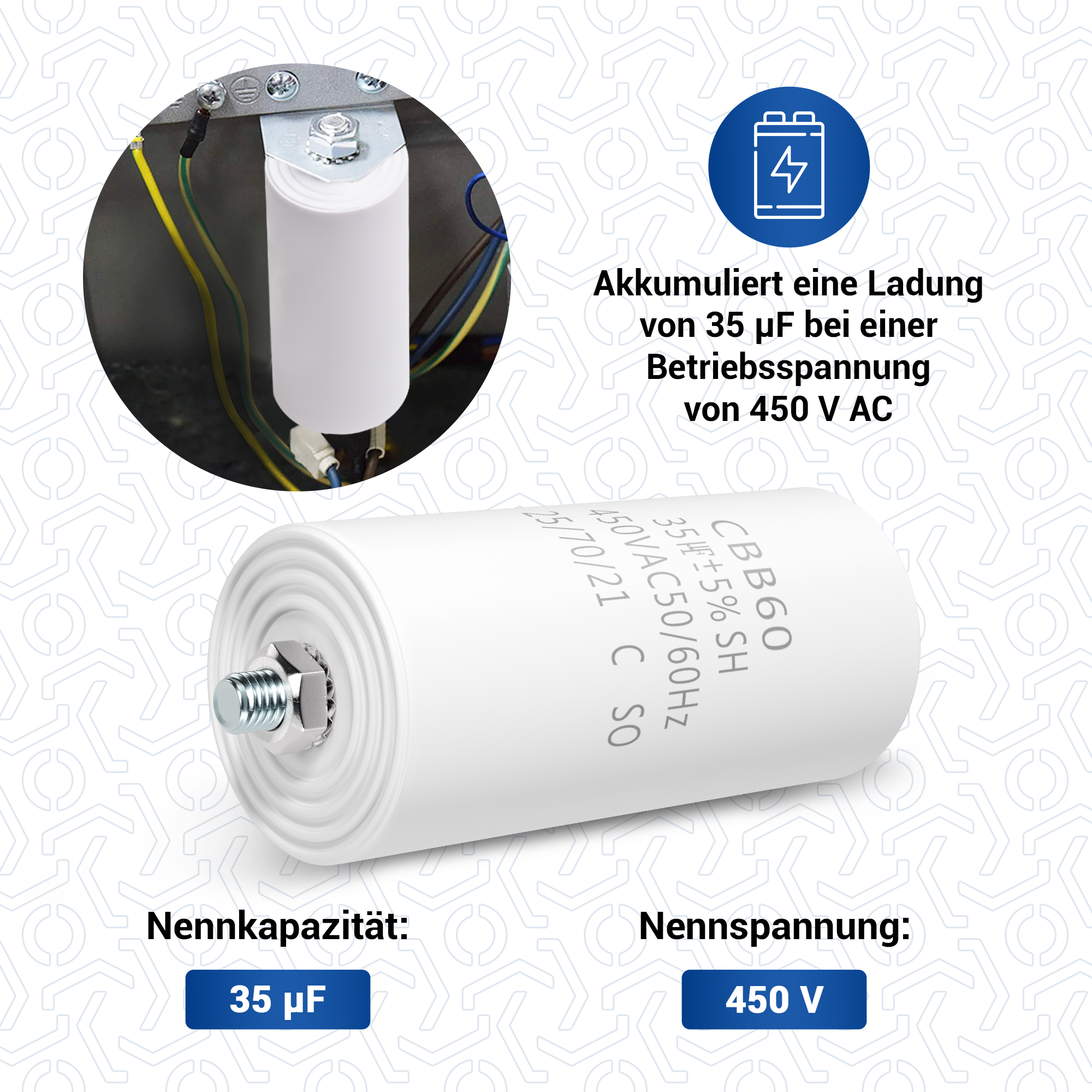 Kondensator universal 35,00µF CBB60 mit Steckfahnen für Trockner