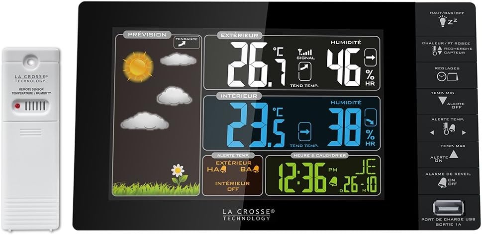 Die La Crosse Technology WS6827-BLA ist eine Wetterstation mit gut ablesbarem Farbdisplay zur Anzeige wichtiger Zeit- und Wetterinformationen. Die Uhrzeit kann manuell eingestellt werden und unterstützt das 12- oder 24-Stundenformat. Ein Kalender zeigt Monat, Tag und Datum. Die integrierte Weckfunktion bietet eine Schlummerfunktion mit 10 Minuten. Für die Anzeige der Wochentage kann zwischen Englisch und Französisch gewählt werden. Die Datenübertragung erfolgt kabellos per Funk mit 433 MHz. Die Funkreichweite beträgt bis zu 90 m im freien Feld. Eine Anzeige für niedrigen Batteriestand unterstützt die rechtzeitige Wartung. Das Gerät ist für das Aufstellen auf einer glatten Oberfläche vorgesehen. Die Basisstation misst 137,2 x 42,8 x 111,8 mm. Die Stromversorgung erfolgt über 2 AA LR6 1,5 V Batterien. Der Außensensor misst 40 x 20 x 130 mm und wird ebenfalls mit 2 AA LR6 1,5 V Batterien betrieben.