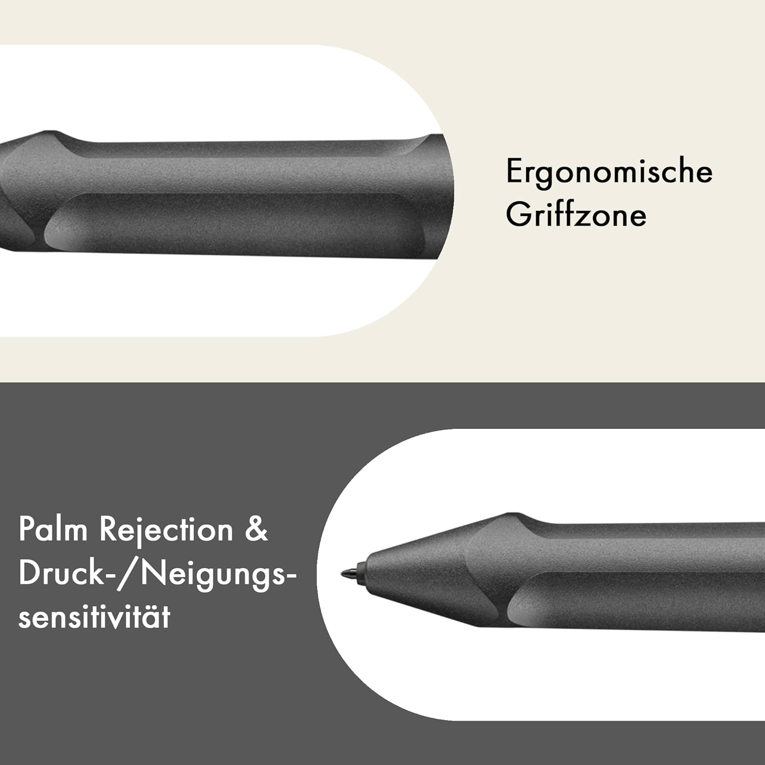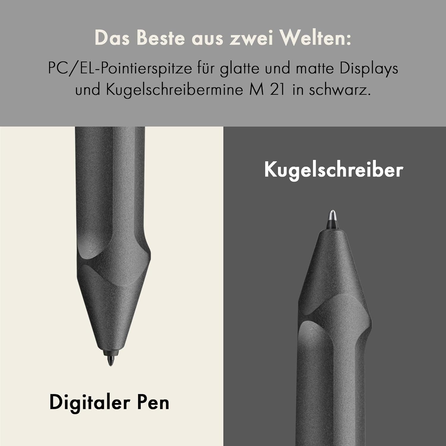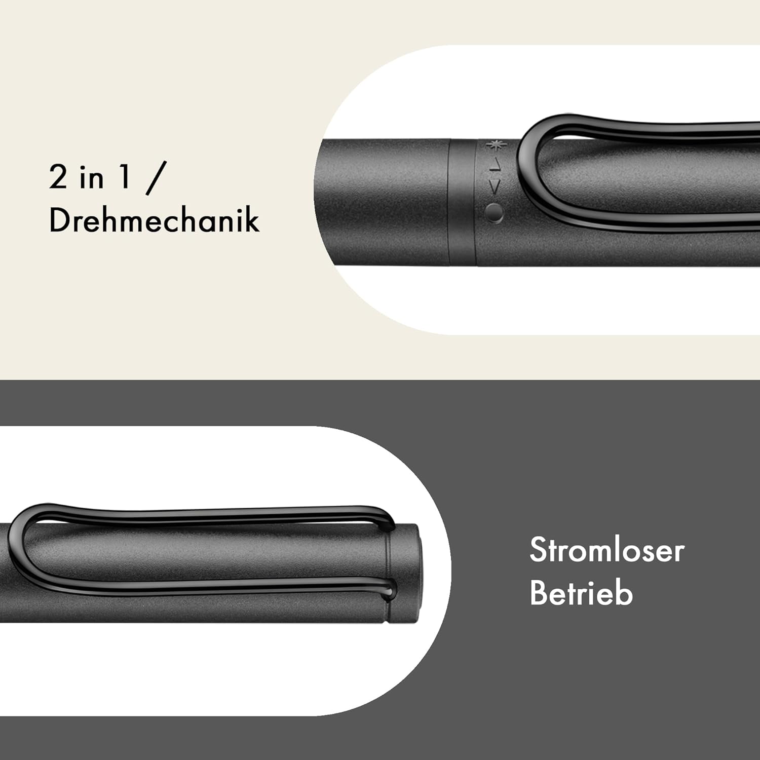 Der LAMY safari twin pen EMR all black kombiniert einen digitalen Eingabestift mit einem klassischen Kugelschreiber in einem Gehäuse. Über einen Drehmechanismus lässt sich schnell zwischen Stylus und Kugelschreiber wechseln. Die EMR Technologie ermöglicht die Nutzung ohne Batterie oder Akku an kompatiblen Endgeräten. Die ergonomisch geformten Griffflächen unterstützen komfortables Schreiben auch bei längerer Nutzung. Der Stift eignet sich zum Schreiben, Skizzieren und Zeichnen auf kompatiblen Android Geräten sowie auf Papier. Die PC EL Spitze ist für präzise Eingaben ausgelegt und kann bei Bedarf gewechselt werden. Auch die Kugelschreibermine ist austauschbar und für den Alltagseinsatz konzipiert. Das Gehäuse im Farbton all black bietet ein schlichtes, professionelles Erscheinungsbild. Im Lieferumfang sind eine schwarze Kugelschreibermine LAMY M 21, zwei PC EL Spitzen, eine Pinzette und eine Bedienungsanleitung enthalten.