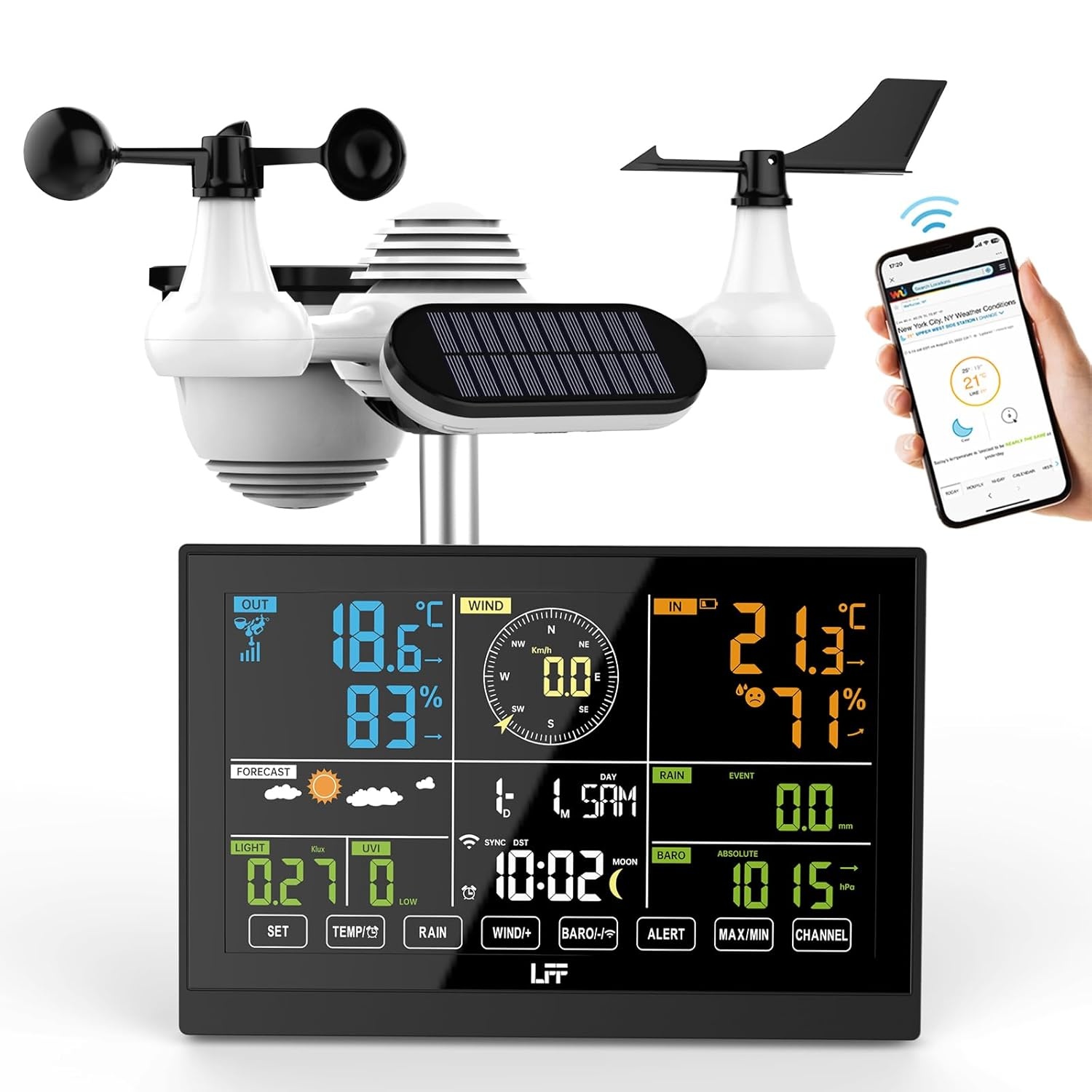 Die LFF WLAN Funkwetterstation liefert umfangreiche Wetterdaten für Zuhause und Garten und zeigt Messwerte übersichtlich auf einem großen 7,5 Zoll Farbdisplay an. Der 7-in-1 Außensensor erfasst Windgeschwindigkeit und Windrichtung, Außentemperatur und Luftfeuchtigkeit, Niederschlagsmenge über Regenmesser sowie UV Index und Lichtintensität. Zusätzlich stellt die Station den Luftdruck dar und bietet eine Wettervorhersage zur schnellen Orientierung. Über eine WLAN Verbindung im 2,4 Gigahertz Netz können Messdaten mit Wetterdiensten synchronisiert werden, sodass aktuelle Werte und Verlaufsdaten auf Smartphone, Tablet oder Rechner abrufbar sind. Die Funkübertragung des Außensensors ist für große Reichweiten ausgelegt und eignet sich besonders für freie Aufstellorte. Für mehr Komfort verfügt das Display über eine Hintergrundbeleuchtung mit vier Helligkeitsstufen. Einstellbare Alarmfunktionen informieren bei Über oder Unterschreitung definierter Grenzwerte, zum Beispiel bei Temperatur, Luftfeuchtigkeit, Wind, Luftdruck, Niederschlag oder UV Index. Der Außensensor ist für die Mastmontage vorgesehen und kombiniert mehrere Messmodule in einer Einheit. Geeignet als persönliche Wetterstation für Haus, Garten, Gewächshaus, Büro oder Hof.