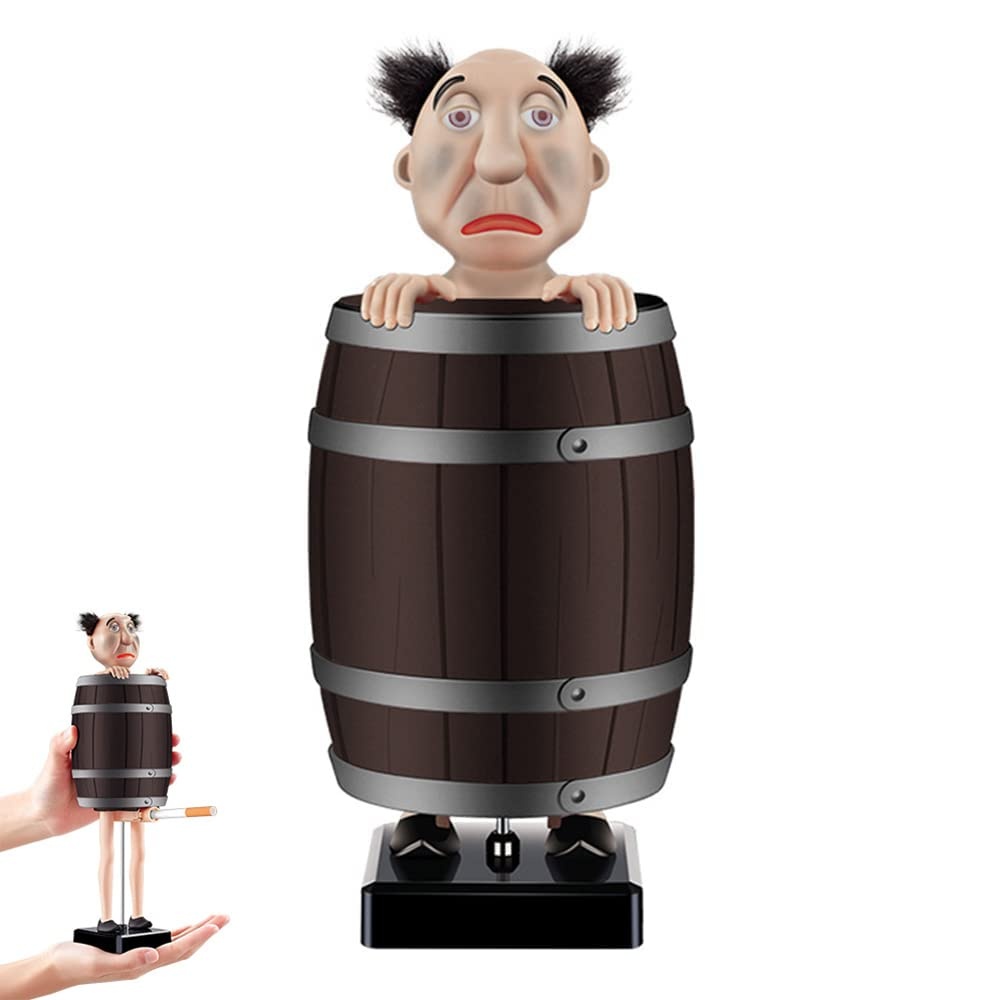 Dieser lustige Zigarettenspender in Figurenform Mann im Fass sorgt für einen originellen Hingucker und bietet eine praktische Pop Up Entnahme. Das Gehäuse besteht aus Harz mit detailreicher Optik und glatten, abgerundeten Kanten für angenehmes Handling. Eine dichte Konstruktion hilft, den Inhalt vor Feuchtigkeit zu schützen. Der Mechanismus ist für eine einfache Bedienung ausgelegt und unterstützt ein komfortables Öffnen und Schließen. Der Spender ist kompakt und eignet sich zum Mitnehmen in Tasche oder Rucksack. Die Kapazität beträgt bis zu 9 Zigaretten, die geordnet eingesetzt werden. Durch das witzige Design eignet sich der Spender als Party Gag, Streichgeschenk oder als kleine Dekoration im Wohnbereich. Farbe wie abgebildet. Maße ca. 8,5 x 8,5 x 21,5 cm. Nettogewicht ca. 350 g.