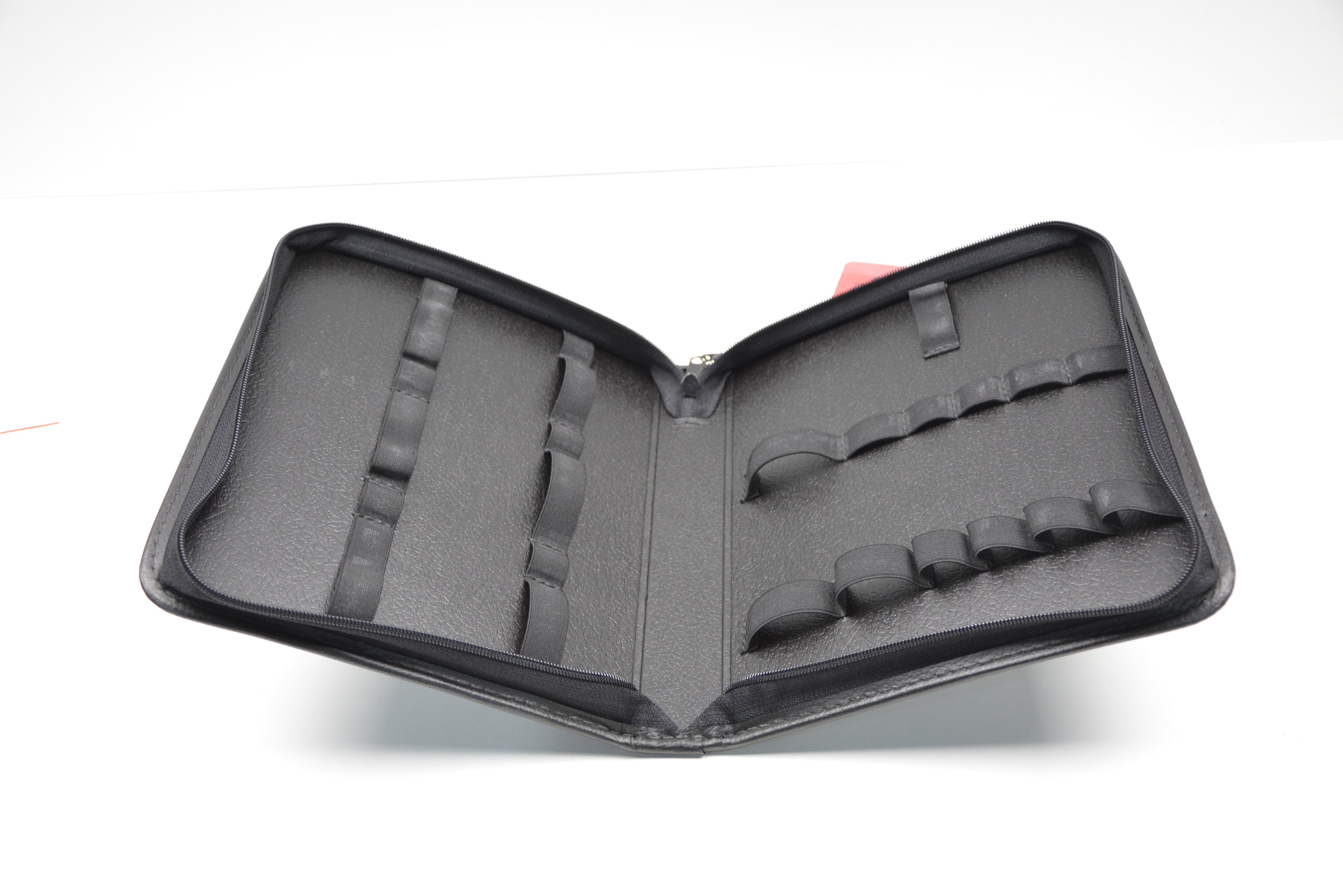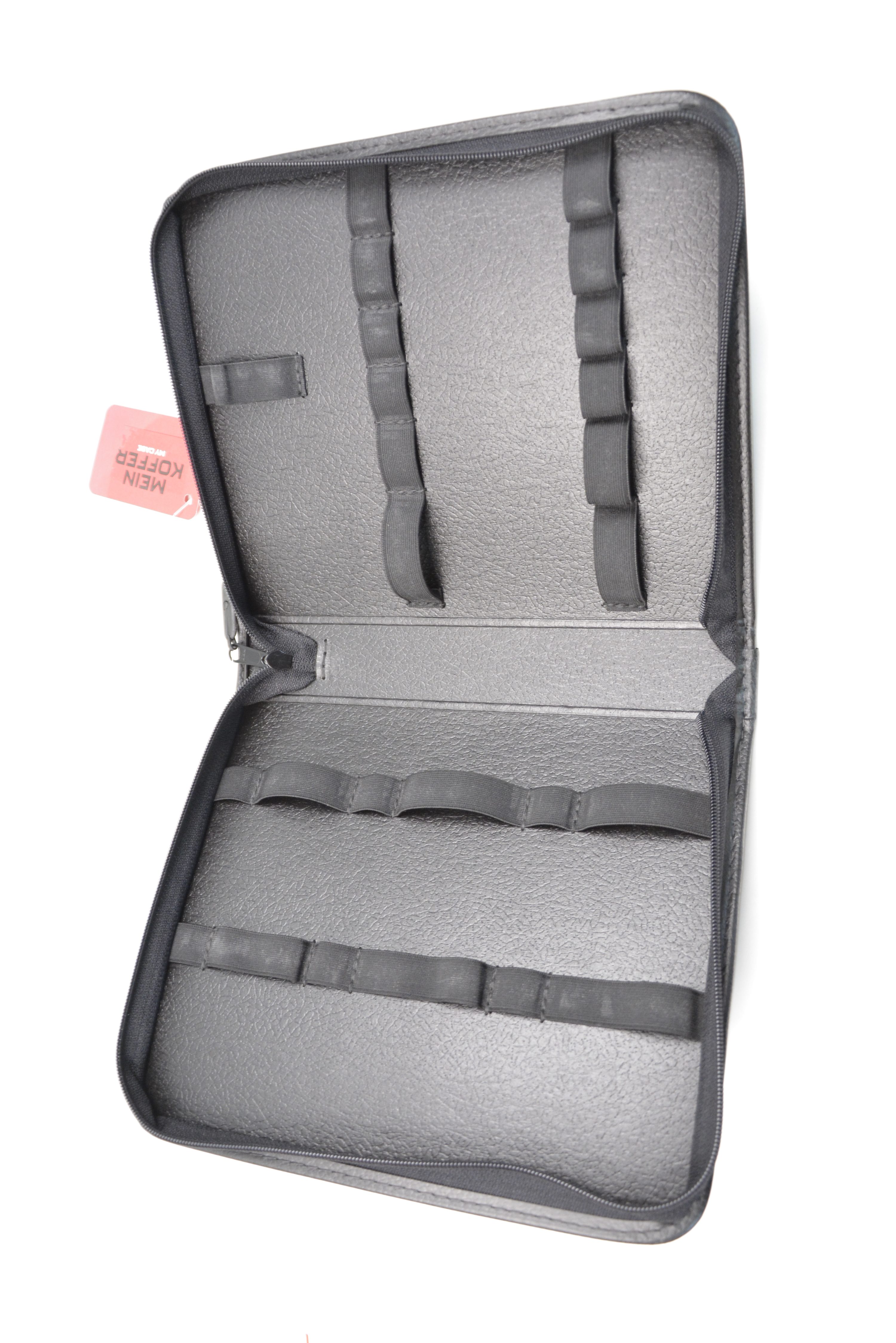 Die Parat Werkzeugmappe 5650.030-061 ist eine kompakte Aufbewahrungslösung für Handwerkzeug und Zubehör. Die Mappe besteht aus strapazierfähigem Kunstleder und ist in Schwarz gehalten. Ein umlaufender Reißverschluss sorgt für sicheres Verschließen und schützt den Inhalt beim Transport. Die Tasche lässt sich aufklappen und ermöglicht einen schnellen Zugriff auf das Werkzeug. Insgesamt 25 vernähte Gummischlaufen dienen zur geordneten Aufnahme von Werkzeugen unterschiedlicher Größe. Durch die übersichtliche Anordnung wird eine einfache Vollständigkeitsprüfung der Werkzeuge unterstützt. Mit den kompakten Abmessungen von 255 x 45 x 225 mm eignet sich die Mappe für Serviceeinsätze und mobile Anwendungen. Das geringe Eigengewicht von etwa 0,4 kg erleichtert das Mitführen. Die Ausführung wird ohne Werkzeug geliefert und ist ideal zum individuellen Bestücken.