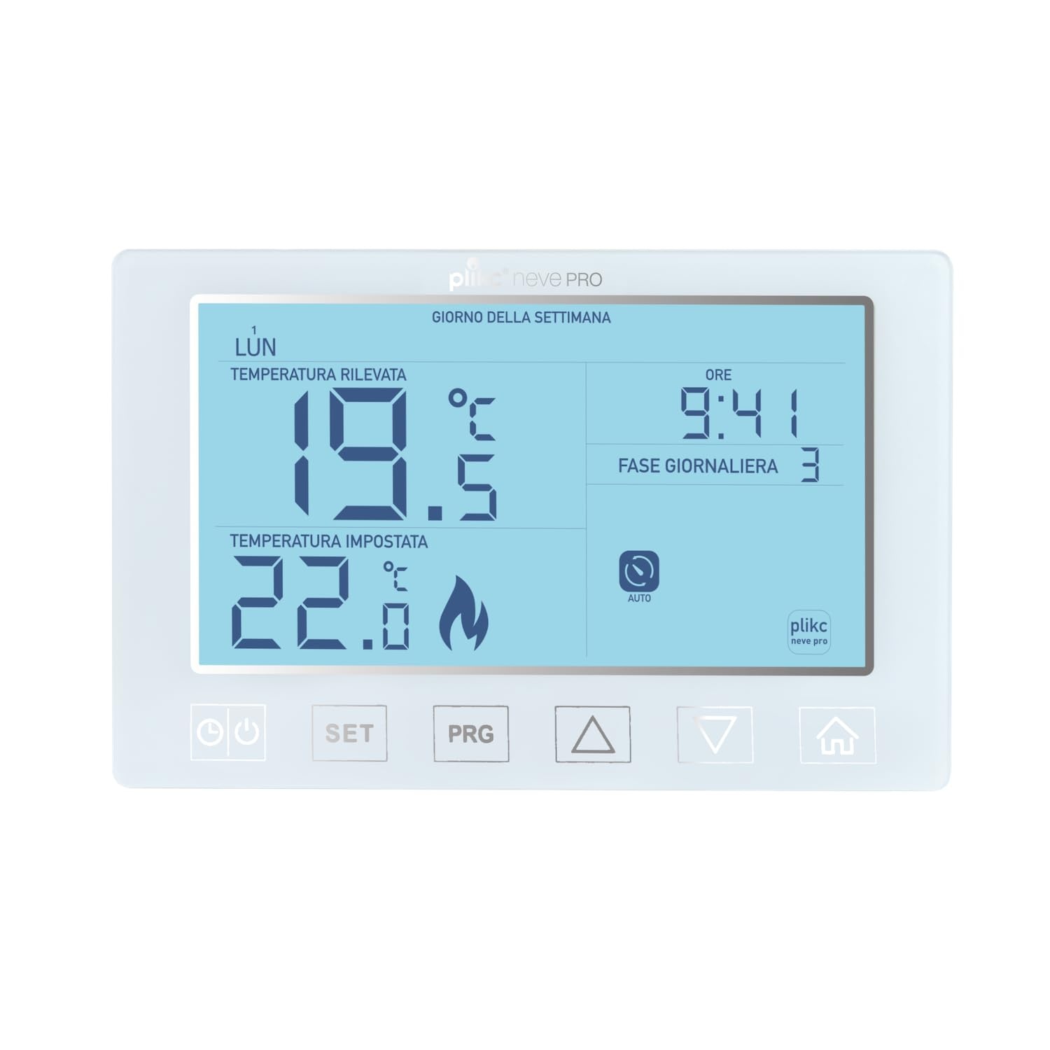 Das Plikc digitale Wochenthermostat Schnee PRO ist für die zeitgesteuerte Regelung von Heizungs- und Kühlsystemen ausgelegt und unterstützt Winter- und Sommerbetrieb. Es bietet eine Wochenprogrammierung mit bis zu 8 täglichen Phasen und ermöglicht das Entfernen nicht benötigter Phasen für eine besonders passende Zeitplanung. Der Betrieb erfolgt batteriebetrieben mit zwei AA Batterien und ist dadurch unabhängig von einer separaten Stromversorgung. Das Relais verfügt über einen potenzialfreien Kontakt mit Umschaltmöglichkeit und eignet sich für 2- oder 3-Draht-Anschlüsse. Über die Funktion ohne Programm kann das Gerät wie ein klassisches Thermostat genutzt werden, indem lediglich eine Zieltemperatur eingestellt wird. Zusätzlich stehen manuelle Betriebsarten für dauerhafte, vorübergehende oder stundenweise Anpassungen zur Verfügung. Eine Urlaubsfunktion unterstützt das zeitweise Absenken oder Anheben der Temperatur bei Abwesenheit. Das Gerät ist kompatibel mit vielen Anwendungen wie Heizkesseln, Zonenventilen, Fußbodenheizungen, Wärmepumpen sowie Klimageräten. Die kompakten Maße betragen 12,5 x 8 x 2,5 cm.