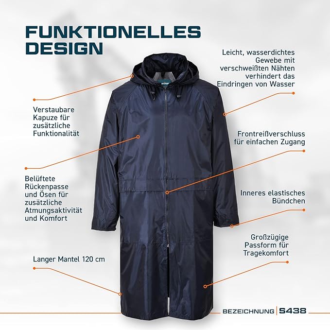 Der Portwest S438 Classic Regenumhang ist für zuverlässigen Schutz bei Regen und Nässe ausgelegt und bietet durch die längere Schnittform eine gute Abdeckung. Das Material besteht aus 100 Prozent Polyester mit PVC Beschichtung und ist auf robusten Einsatz ausgelegt. Wasserdicht versiegelte Nähte unterstützen den Schutz vor eindringender Feuchtigkeit. Die Kapuze ist fest angebracht und sorgt für zusätzlichen Schutz im Kopfbereich. Mit einem Stoffgewicht von 210 g pro Quadratmeter bietet der Umhang eine stabile, griffige Qualität. Der Umhang eignet sich für Arbeiten im Freien, Wege bei schlechtem Wetter sowie für Freizeit und Alltag. Die längere Form kann mit passender Regenhose kombiniert werden, um den Wetterschutz zu erhöhen. Pflegeleichte Oberflächen unterstützen eine einfache Reinigung nach dem Einsatz. Geeignet für wechselnde Wetterbedingungen und regelmäßige Nutzung.