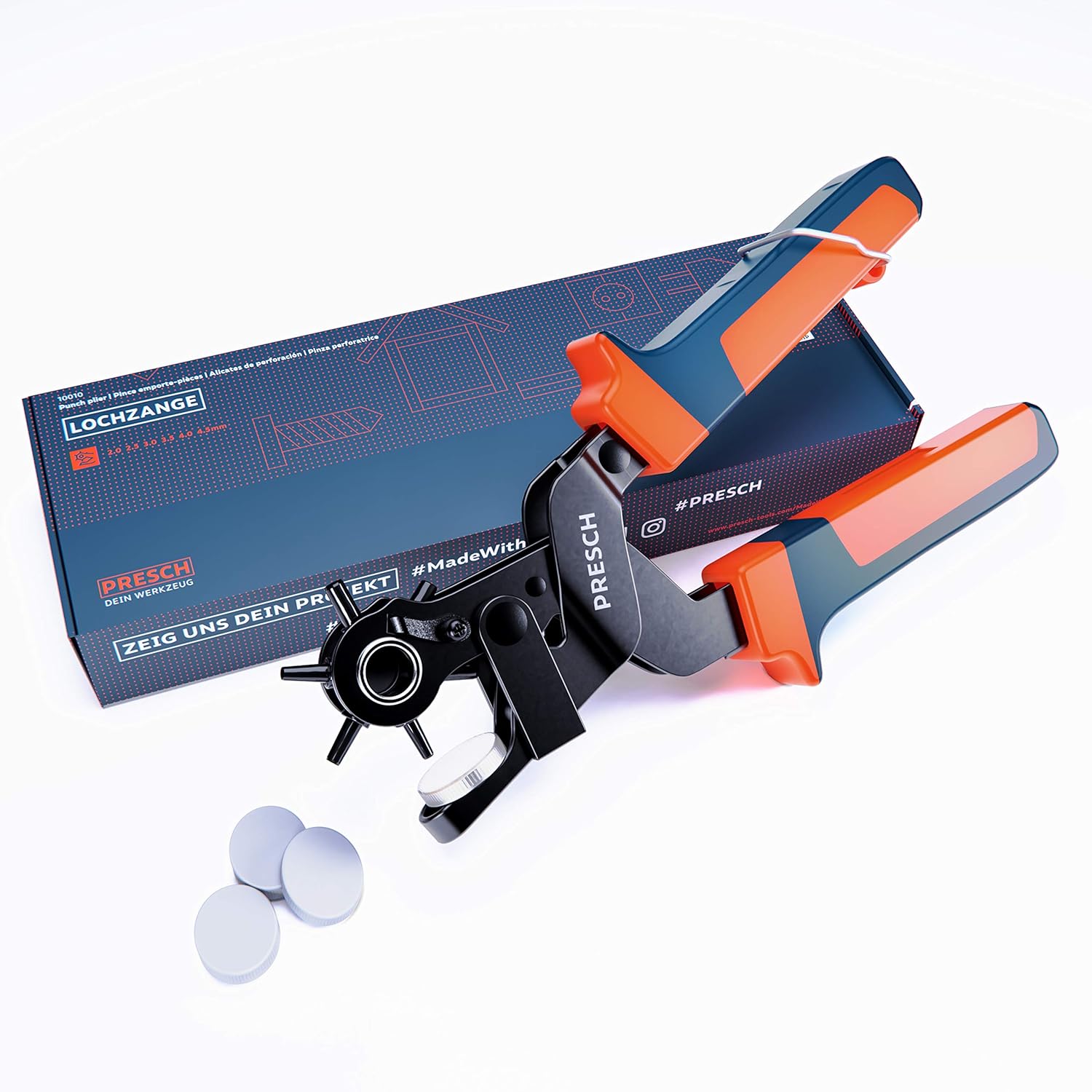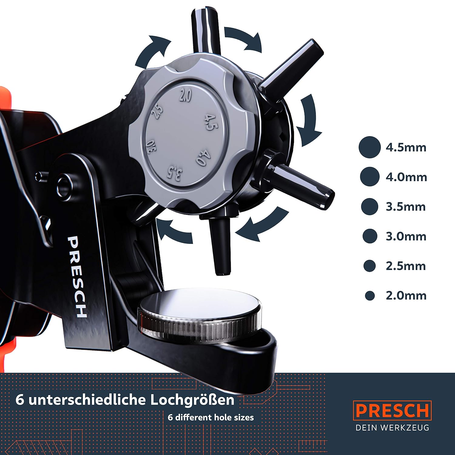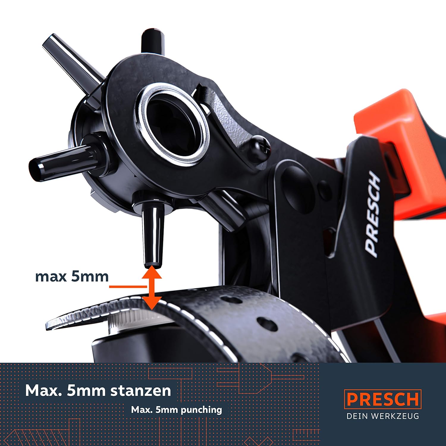 Die Presch Lochzange ist eine robuste Revolverlochzange zum sauberen Stanzen gleichmäßiger Löcher in verschiedenen Materialien. Sie eignet sich für Lederarbeiten und Reparaturen, zum Anpassen von Gürteln sowie für Bastel- und Werkstattaufgaben. Die Hebelübersetzung unterstützt eine kraftsparende Bedienung, während die Öffnungsfeder das erneute Öffnen erleichtert. Über das drehbare Lochrad stehen sechs Lochgrößen zur Auswahl, die sich schnell umschalten lassen. Scharfe Lochstempel sorgen für präzise Stanzkanten und reduzieren Ausfransen. Der ergonomische, rutschfeste Griff liegt sicher in der Hand und unterstützt kontrolliertes Arbeiten. Die stabile Metallkonstruktion ist auf Langlebigkeit ausgelegt. Mit den mitgelieferten Stanzunterlagen lässt sich materialschonend arbeiten und die Unterlage schützen. Geeignet zum Lochen von Gürtel, Leder, Stoff, Karton und Pappe. Auch zum Entwerten von Plaketten und Kennzeichen verwendbar.