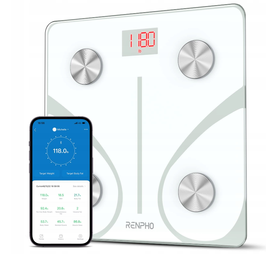 Die RENPHO Körperfettwaage ist eine digitale Personenwaage mit Bluetooth-Anbindung zur komfortablen Auswertung in der RENPHO Health App. Vier hochpräzise Gewichtssensoren und vier Elektroden unterstützen genaue und zuverlässige Messwerte. Die Waage misst bis 180 kg und zeigt Veränderungen in feinen Schritten an. Neben dem Körpergewicht erfasst sie wichtige Körperwerte wie Körperfettanteil, Körperwasser, Muskelmasse, Protein, viszerales Fett, BMI und BMR. Das gut ablesbare Display erleichtert die Nutzung im Alltag, zudem arbeitet die Waage mit automatischer Ein und Ausschaltfunktion. Eine Anzeige für schwache Batterie und Überlastung unterstützt den sicheren Betrieb. Die 5 mm starke Plattform aus gehärtetem Glas ist robust und pflegeleicht. In der App können mehrere Benutzerprofile angelegt werden, sodass die Waage für Familien geeignet ist. Ein Babymodus ermöglicht das Verfolgen von Gewichtsverläufen bei Kindern und Haustieren. Die App kann Messdaten mit gängigen Fitnessdiensten wie Samsung Health, MyFitnessPal, Fitbit und Apple Health synchronisieren.