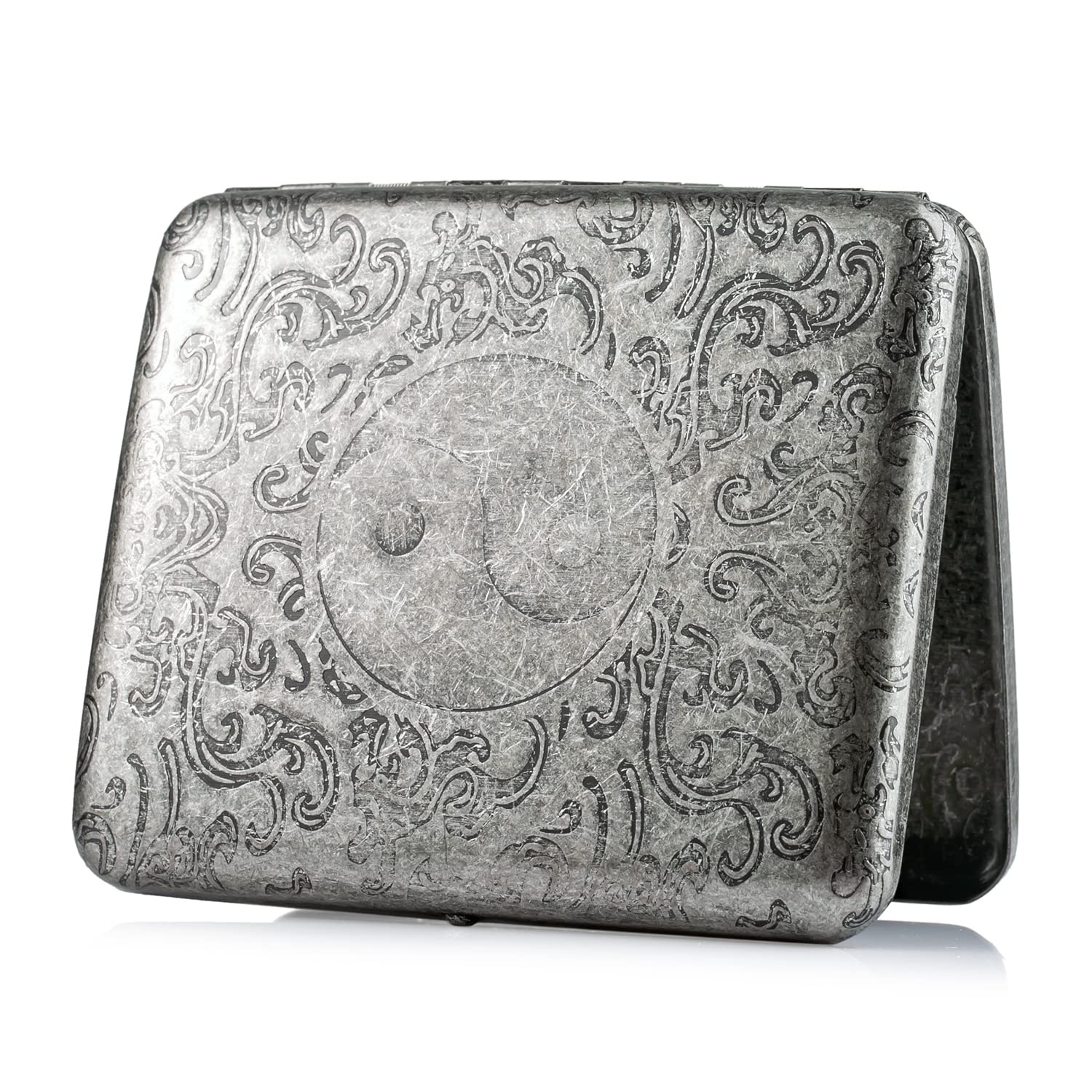 Dieses Retro Zigarettenetui aus Metall schützt Zigaretten zuverlässig im Alltag und unterwegs. Die harte Außenhülle hilft, Quetschungen und Bruch zu vermeiden. Eine integrierte Metallspange hält die Zigaretten sicher an ihrem Platz, damit sie nicht verrutschen. Das Etui ist kompakt und passt gut in Jackentasche, Hosentasche oder Handtasche. Es ist für bis zu 20 Zigaretten in normaler Größe ausgelegt. Das Taiji Motiv sorgt für eine klassische Vintage Optik. Die glatte Metalloberfläche ist pflegeleicht und lässt sich schnell reinigen. Der Verschluss ist einfach zu öffnen und zu schließen. Das Material ist robust und auf langlebige Nutzung ausgelegt.