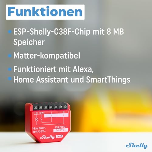 Der Shelly 1PM Gen3 ist ein kompakter WLAN Smart Relais Schalter zur Unterputz Montage und eignet sich zum Schalten sowie zur präzisen Strommessung von angeschlossenen Verbrauchern. Das Set enthält 2 Stück und ist ideal für Lichtkreise, Heizungen oder andere elektrische Geräte im Smart Home. Die Steuerung erfolgt bequem per App, zusätzlich sind Zeitpläne und Timer für automatisierte Abläufe möglich. Durch die integrierte Leistungsmessung lassen sich Verbrauchsdaten in Echtzeit erfassen und zur Optimierung des Energieverbrauchs auswerten. Der Schalter arbeitet im 2,4 GHz WLAN und benötigt keinen separaten Hub. Unterstützt werden moderne Integrationsmöglichkeiten wie MQTT, Webhooks und sichere Netzwerkprotokolle. Der neue Prozessor mit erweitertem Speicher sorgt für schnelle Reaktionen und stabile Automationen. Zusätzlich kann das Gerät als WLAN Reichweitenverlängerer und Bluetooth Gateway eingesetzt werden. Geeignet für 1 Kanal Schaltbetrieb bis 16 A bei 240 V AC oder bis 10 A bei 30 V DC.