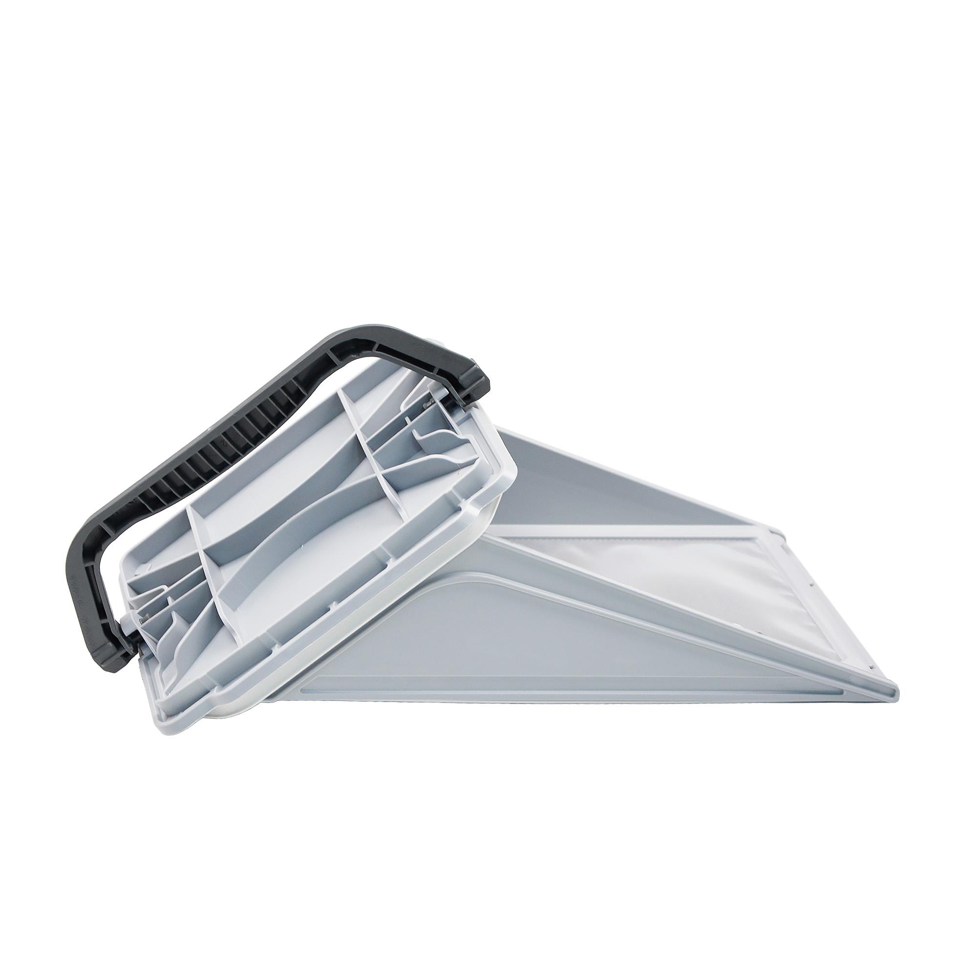 Dieser graue Kunststoffrahmen inklusive Abdeckung, Handgriff und schwarzem Schaumfilter ist meist unten links im Sockel des Kondenstrockners eingesetzt.