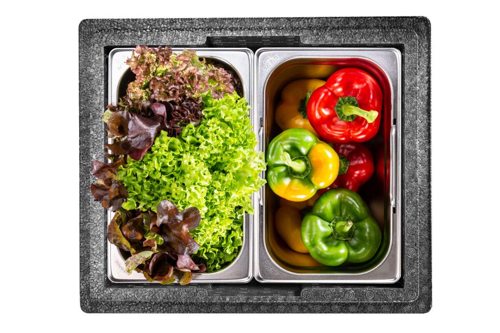 Die thermohauser EPP Thermobox im GN 1 2 Format eignet sich für den sicheren Transport und die Zwischenlagerung von warmen und kalten Speisen. Das expandierte Polypropylen ist besonders leicht und zugleich robust für den täglichen Einsatz in Gastronomie und Catering. Die Box bietet eine hohe Isolierwirkung und ist für einen Temperaturbereich von etwa minus 40 Grad Celsius bis plus 120 Grad Celsius ausgelegt. Durch das geringe Eigengewicht lässt sie sich auch befüllt komfortabel tragen. Passend für Standard GN Behälter und Tabletts bis GN 1 2. Boxen mit gleichen Grundmaßen sind stapelbar und dadurch platzsparend beim Transport und bei der Lagerung. Die Reinigung ist einfach unter heißem Wasser mit Spülmittel oder in der Spülmaschine möglich. Außenmaße 39 x 33 x 18 cm. Innenmaße 33 x 27 x 12 cm. Volumen 10 Liter. Farbe Schwarz. Deckel ist im Lieferumfang enthalten.