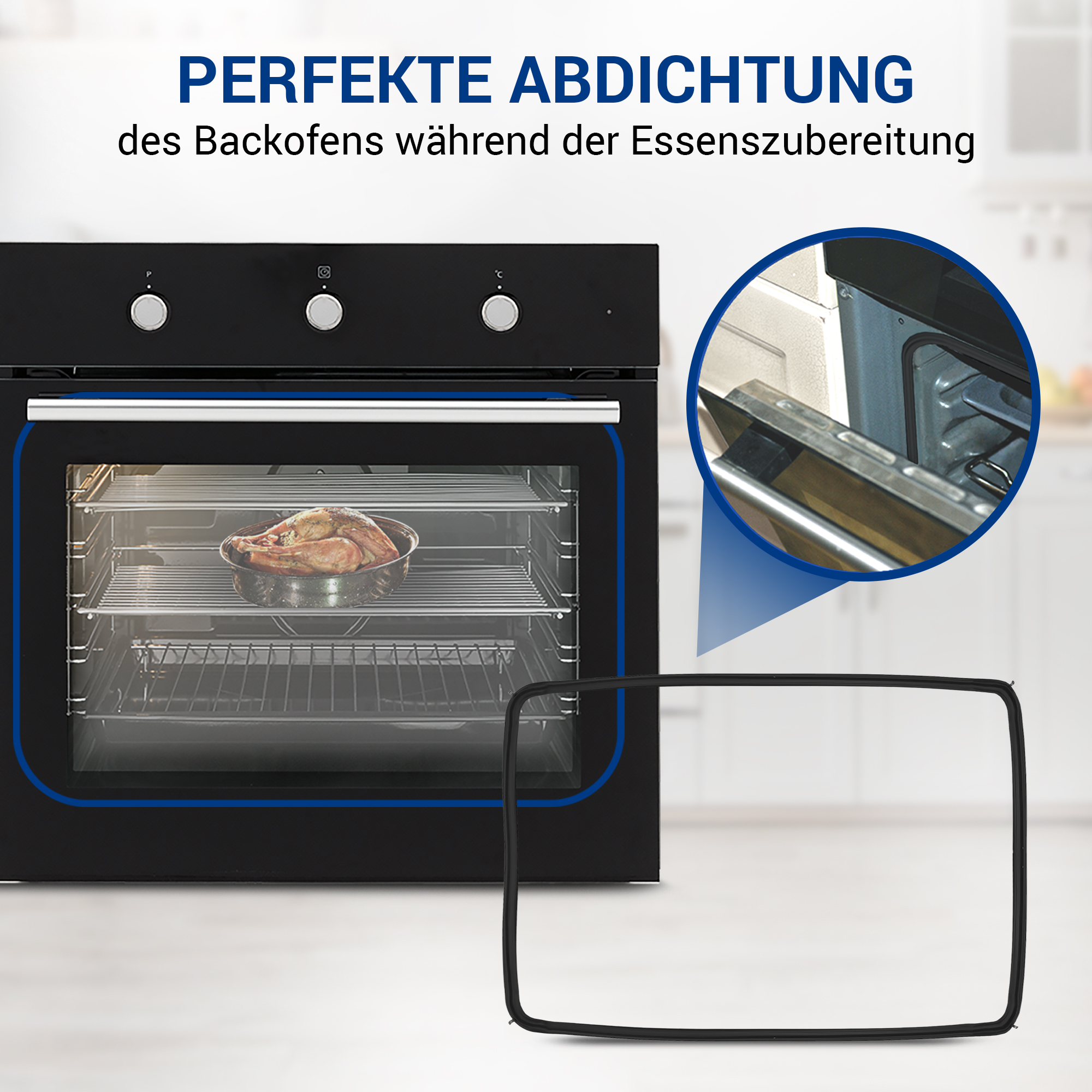 Die vierseitige schwarze Gummidichtung wird mit den 4 Haken (Halteklammern) in den Rahmen vom Ofen-Garraum im Herd eingesetzt.