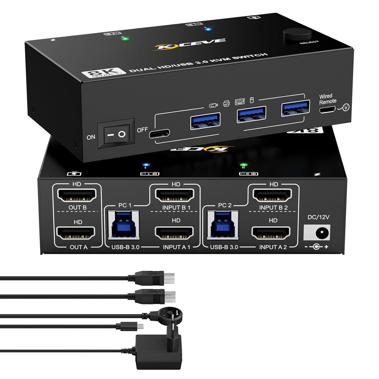 Dieser USB 3.0 KVM-Switch ermöglicht die komfortable Steuerung von zwei Computern an zwei HDMI-Monitoren mit nur einer gemeinsamen Maus und Tastatur. Er unterstützt hohe Auflösungen bis 8K bei 60 Hz sowie 4K bei 120 Hz und ist abwärtskompatibel zu gängigen Auflösungen wie 4K bei 60 Hz, 2K bei 144 Hz und 1080p bei 144 Hz. Für die Peripherie stehen mehrere USB-Anschlüsse zur Verfügung, darunter USB-A und USB-C, sodass sich typische Geräte wie Tastatur, Maus, Drucker oder Scanner zentral anschließen lassen. Die USB-3.0-Schnittstelle ermöglicht schnelle Datenübertragungen bis zu 5 Gbit pro Sekunde, was den Wechsel zwischen den Rechnern ohne ständiges Umstecken erleichtert. Das Umschalten zwischen PC1 und PC2 ist wahlweise über die Taste am Gerät oder über die kabelgebundene Fernbedienung möglich, und Statusanzeigen informieren über die aktive Quelle. Das Gerät arbeitet ohne zusätzliche Treiber und ist damit für eine unkomplizierte Inbetriebnahme geeignet. Es unterstützt aktuelle Standards wie HDMI 2.1 und HDCP 2.3 und ist mit USB 2.0 und USB 1.1 kompatibel. Eine Ein Aus Taste am Gerät kann die Bildschirme ausschalten, ohne den Computer auszuschalten. Geeignet für viele Einsatzbereiche wie Büro, Heimarbeitsplatz, Konferenzraum oder Multimedia-Umgebungen und kompatibel mit Windows, Mac OS, Linux und Chrome OS.