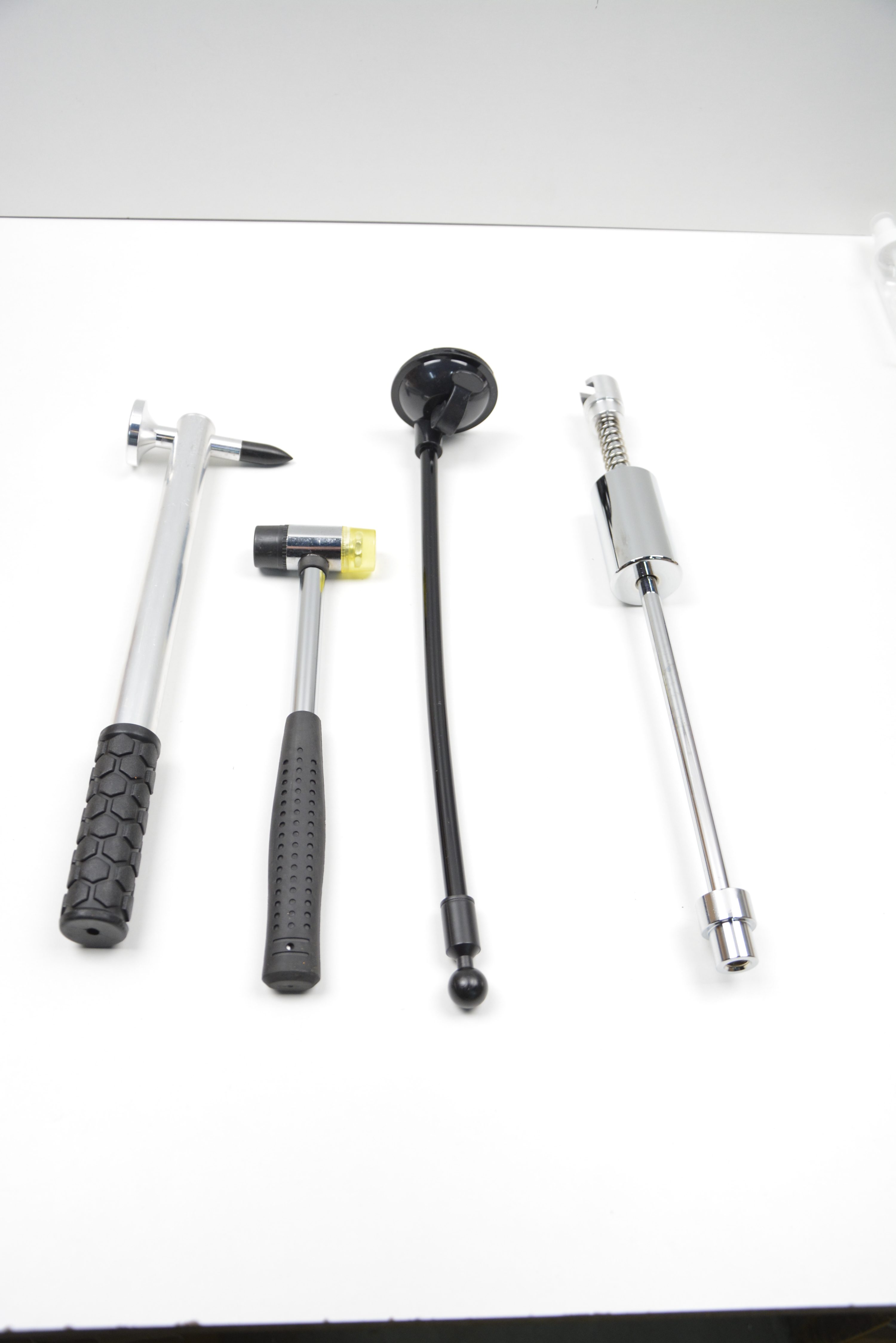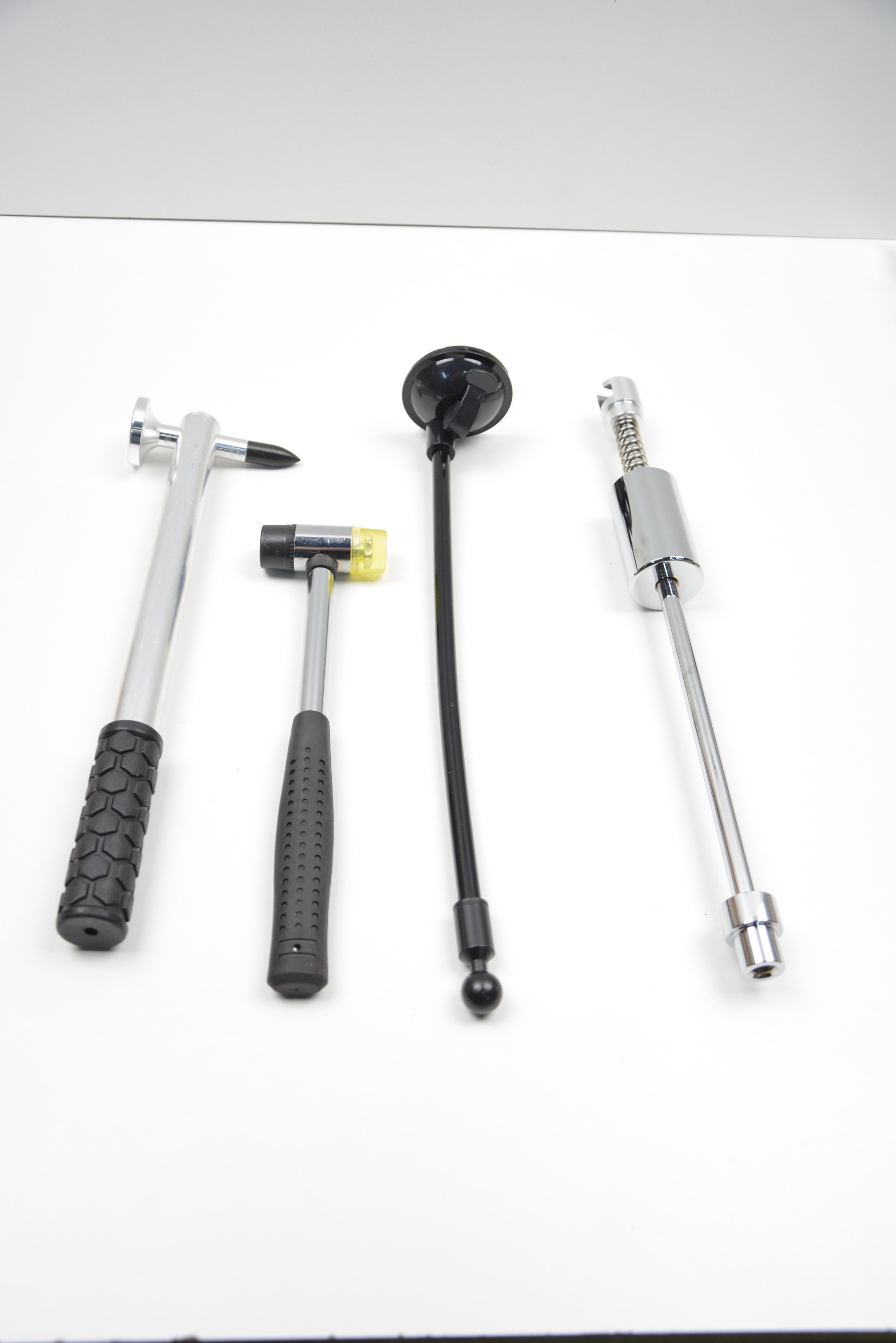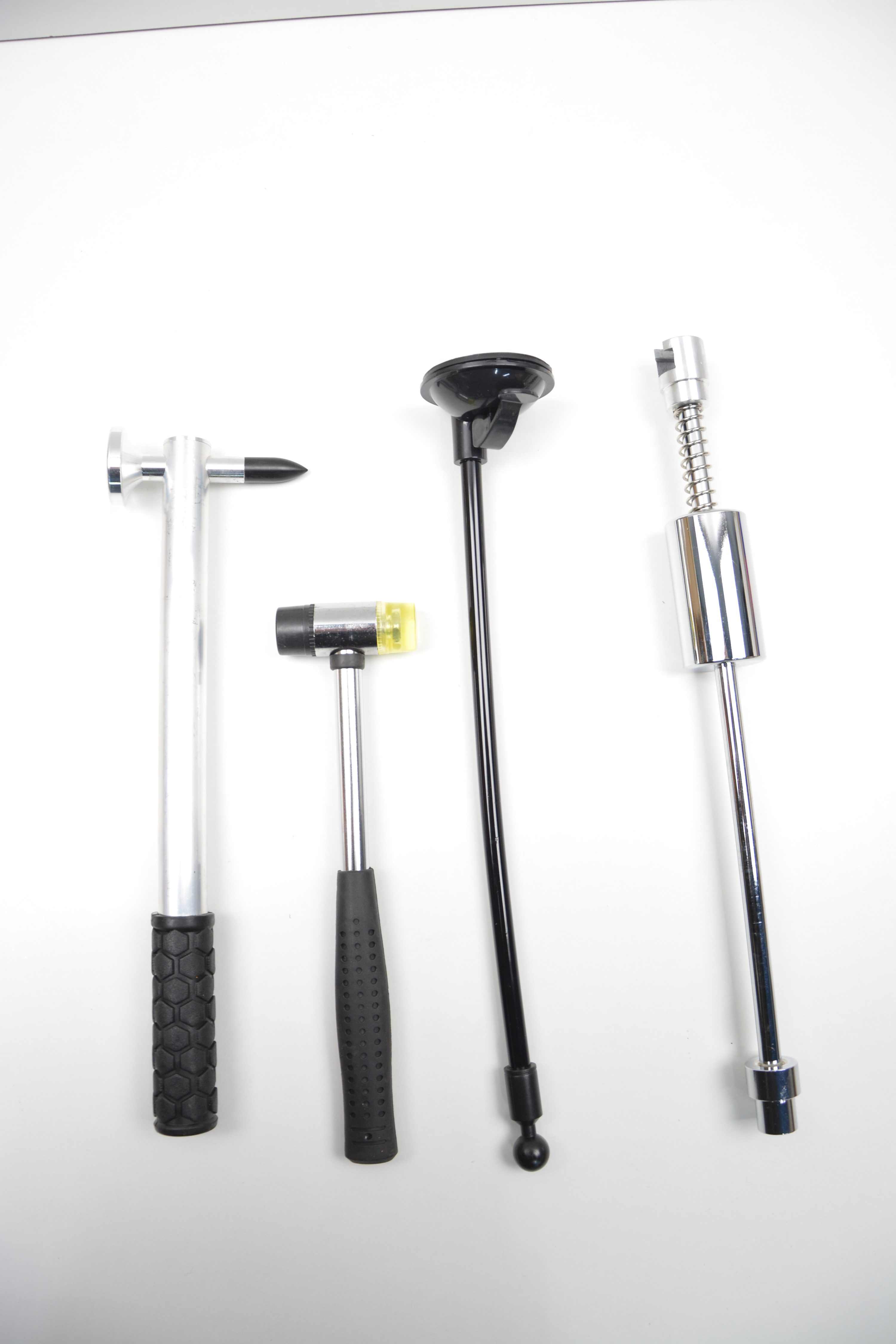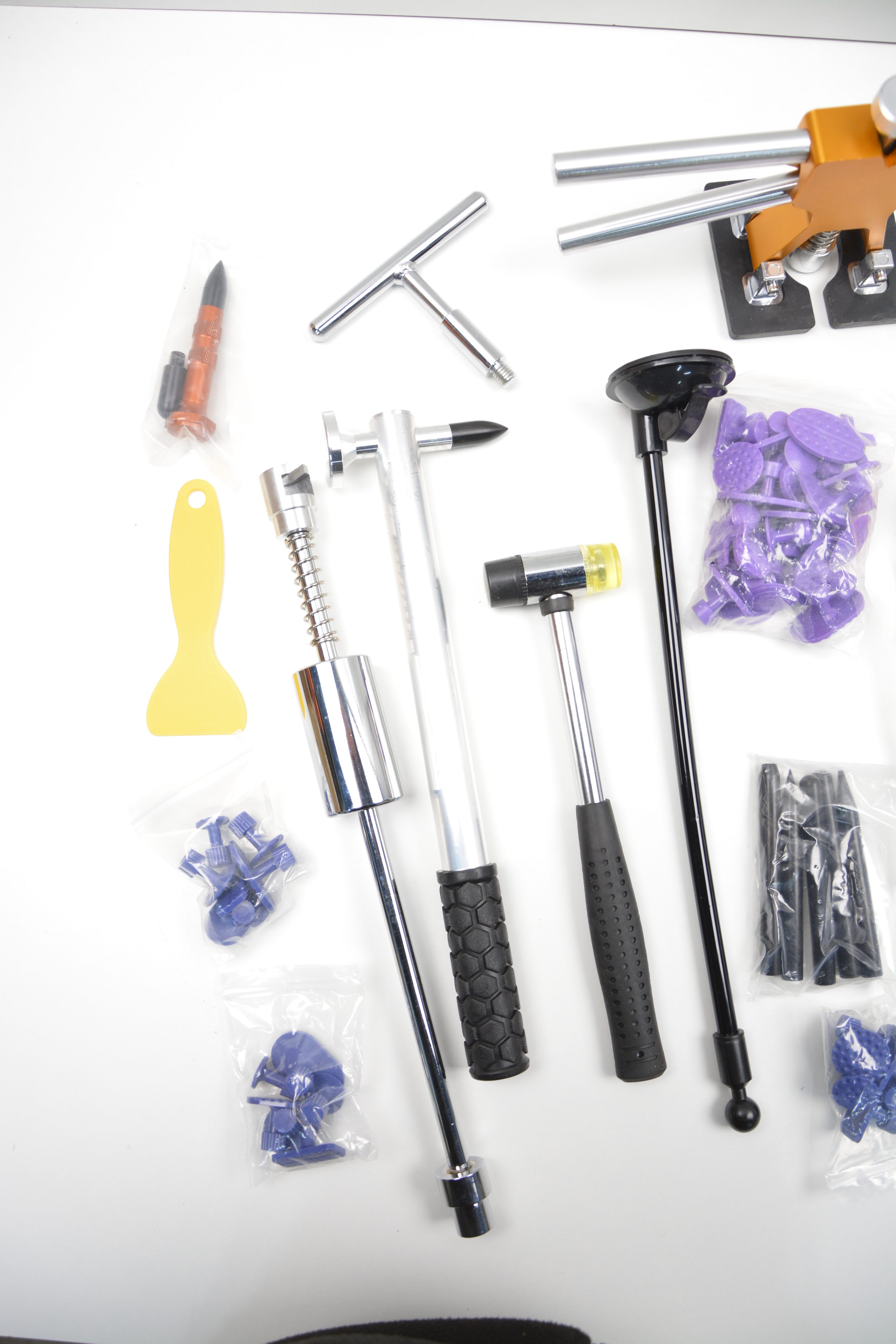 Dieses VEVOR Ausbeulwerkzeug Set mit 89 Teilen ist für die lackschadenfreie Dellenentfernung an Metalloberflächen ausgelegt und eignet sich unter anderem für Karosserieteile, Motorräder sowie Geräte mit Metallgehäuse. Der Zughammer ermöglicht kontrolliertes Ziehen an geklebten Zugadaptern. Der goldfarbene Dellenheber unterstützt das präzise Anheben von Dellen. Der Brückenzieher hilft bei gleichmäßigem Zug auf flächigen Bereichen. Eine Heißklebepistole sorgt für schnelles Aufheizen und sauberes Auftragen des Klebers. Mit den zahlreichen Zugadaptern in verschiedenen Formen lassen sich unterschiedliche Dellengeometrien bearbeiten. Schlagköpfe und Hämmer unterstützen das Nacharbeiten kleiner Unebenheiten. Eine Reflexionshilfe mit Leuchte erleichtert das Erkennen von Dellen und das genaue Positionieren. Reinigungszubehör und Hilfsteile unterstützen die Vorbereitung und das Entfernen von Kleberesten. Geeignet für die Anwendung zu Hause oder in der Werkstatt bei typischen Dellen wie durch Hagel oder Parkrempler.