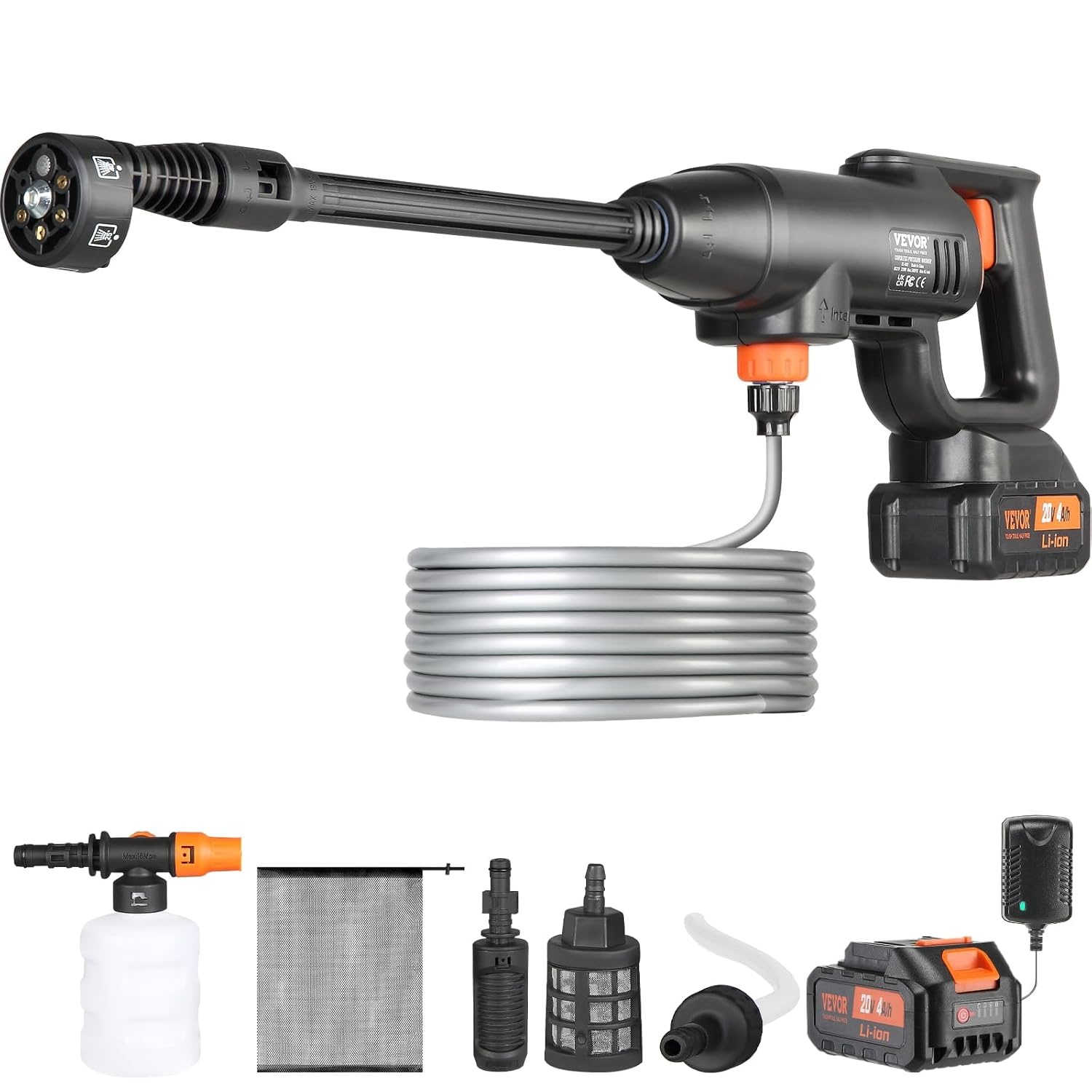 Der VEVOR Akku Hochdruckreiniger ist eine kabellose Druckreinigerpistole für flexible Reinigungsaufgaben rund um Haus und Garten. Mit bis zu 40 bar Arbeitsdruck eignet er sich zum Entfernen hartnäckiger Verschmutzungen an Fahrzeugen, Terrassen und Außenflächen. Ein Normaldruckmodus unterstützt die schonende Alltagsreinigung von Wänden und Böden. Die Durchflussleistung von bis zu 4 Litern pro Minute ermöglicht zügiges Arbeiten. Das geringe Gewicht von etwa 2 kg erleichtert die einhändige Bedienung und den mobilen Einsatz. Im Lieferumfang ist ein 4,0 Ah Akku mit Schnellladegerät enthalten, wodurch längere Einsätze möglich sind. Für unterschiedliche Anwendungen stehen mehrere Düsenoptionen zur Verfügung, darunter eine Hoch und Niederdruckdüse sowie eine Mehrfachdüse. Ein Schaumbehälter unterstützt die Schaumreinigung, zum Beispiel bei der Autowäsche. Der Reiniger kann Wasser aus geeigneten Quellen ansaugen und ist damit auch ohne festen Wasseranschluss nutzbar. Geeignet für vielseitige Anwendungen wie Zäune, Boote, Fenster, Pflastersteine, Mauerspalten sowie zur Bewässerung im Garten.