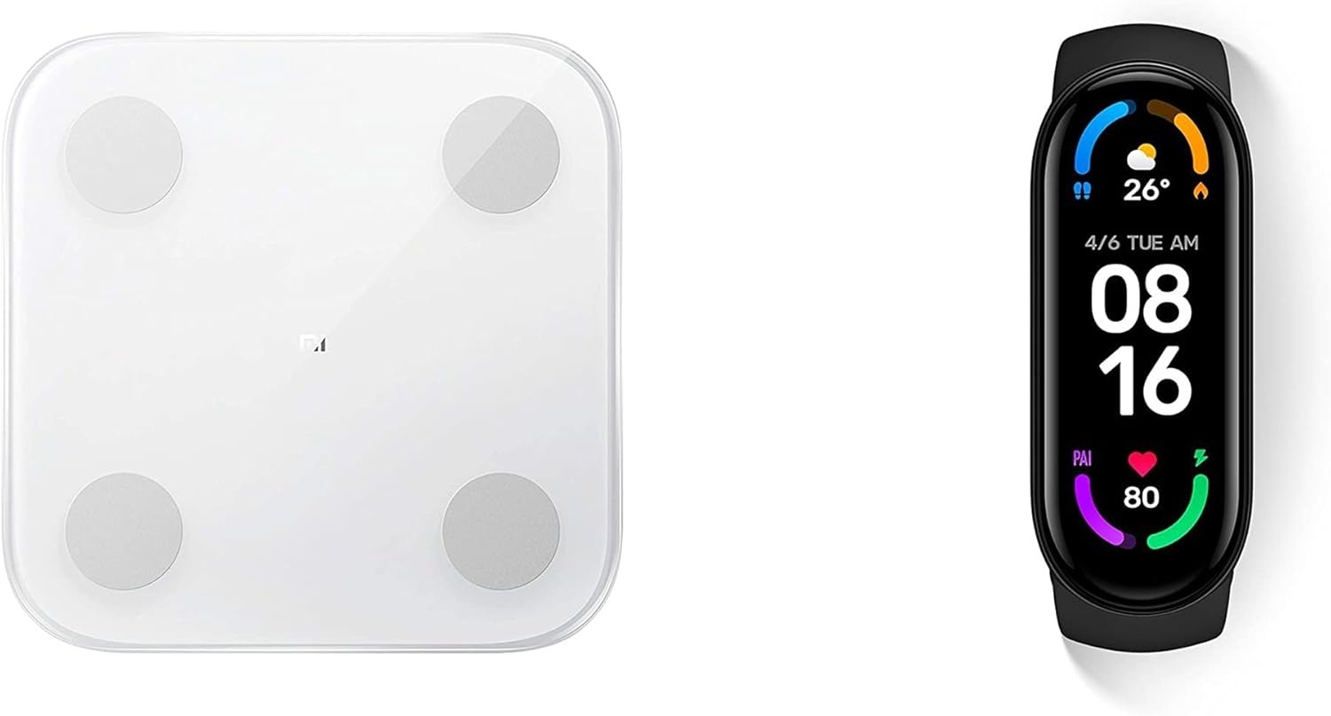 Das Xiaomi Mi Smart Band 6 bietet ein 1,56 Zoll AMOLED Display mit hoher Schärfe und komfortabler Ablesbarkeit. Es unterstützt 30 Trainingsmodi zur Aufzeichnung von Aktivität, Herzfrequenz und Kalorienverbrauch. Die SpO2 Messung hilft bei der Überwachung der Sauerstoffsättigung im Blut. Die Schlafanalyse umfasst auch REM Schlaf sowie Nickerchen und liefert zusätzliche Hinweise zur Schlafqualität. Das Armband ist bis 5 ATM wasserdicht und eignet sich damit auch für Schwimmen. Die Akkulaufzeit beträgt bei normaler Nutzung bis zu 14 Tage und das magnetische Ladesystem erleichtert das Aufladen. Zusätzlich stehen Funktionen wie Musiksteuerung, Kamerasteuerung, Inaktivitätsalarm, Stresslevel, PAI, Atemübungen und Menstruationszyklus Überwachung zur Verfügung. Die Verbindung erfolgt per Bluetooth 5.0 mit der Mi Wear oder Mi Fit App. Die Mi Body Composition Scale misst neben dem Gewicht insgesamt 13 Körperwerte wie Körperfett und Muskelanteil auf Basis von Bioimpedanz und Algorithmen. Sie unterstützt einen Körperbalance Test und kann bis zu 16 Benutzerprofile automatisch verwalten. Die Waage besitzt eine versteckte LED Anzeige sowie eine hohe Messgenauigkeit mit 50 g Empfindlichkeit und ist für 100 g bis 150 kg ausgelegt. Das Material besteht aus gehärtetem Glas und ABS.