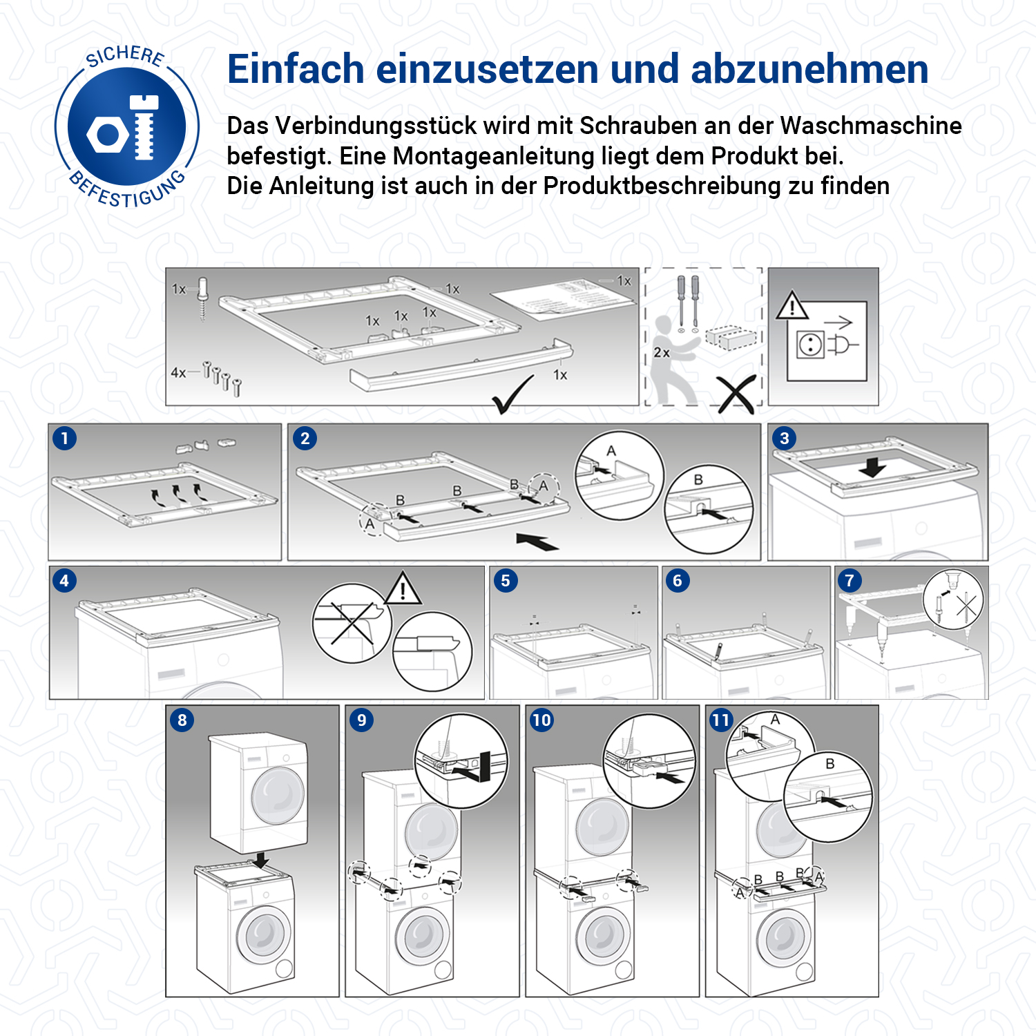 Verbindungssatz ohne Arbeitsplatte, zum Bau einer Waschmaschinen-/Wäschetrockner-Säule